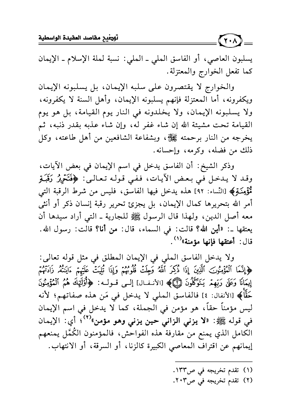 وذكر الشيخ: أن الفاسق يدخل في اسم الإيمان في بعض الآيات، وقد لا يدخل في بعض الآيات، ففي قوله تعالى: {فَتَحْرِيرُ رَقَبَةٍ مُؤْمِنَةٍ} هذه يدخل فيها الفاسق، فليس من شرط الرقبة التي أمر الله بتحريرها كمال الإيمان، بل يجزئ تحرير رقبة إنسان ذكر أو أنثى معه أصل الدين، ولهذا قال الرسول - صلى الله عليه وسلم - للجارية ـ التي أراد سيدها أن يعتقها ـ: أين الله؟ قالت: في السماء، قال: من أنا؟ قالت: رسول الله. قال: أعتقها فإنها مؤمنة " (¬1).