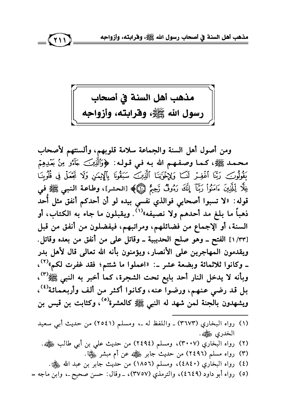 ومن أصول أهل السنة والجماعة سلامة قلوبهم، وألسنتهم لأصحاب محمد - صلى الله عليه وسلم -، كما وصفهم الله به في قوله {وَالَّذِينَ جَاؤُوا مِن بَعْدِهِمْ يَقُولُونَ رَبَّنَا اغْفِرْ لَنَا وَلِإِخْوَانِنَا الَّذِينَ سَبَقُونَا بِالْإِيمَانِ وَلَا تَجْعَلْ فِي قُلُوبِنَا غِلًّا لِّلَّذِينَ آمَنُوا رَبَّنَا إِنَّكَ رَؤُوفٌ رَّحِيمٌ} [(10) سورة الحشر]، وطاعة النبي - صلى الله عليه وسلم - في قوله: "لا تسبوا أصحابي فوالذي نفسي بيده لو أن أحدكم أنفق مثل أحد ذهبا ما بلغ مد أحدهم ولا نصيفه" (¬1).