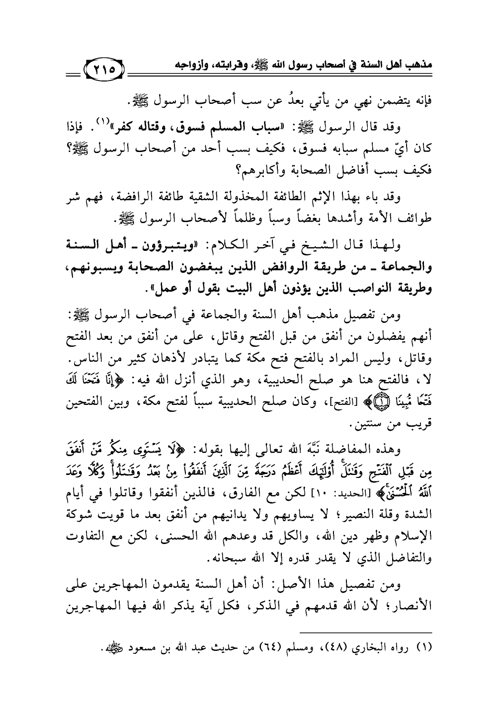 ومن تفصيل مذهب أهل السنة والجماعة في أصحاب الرسول - صلى الله عليه وسلم -: أنهم يفضلون من أنفق من قبل الفتح وقاتل على من أنفق من بعد الفتح وقاتل، وليس المراد بالفتح فتح مكة كما يتبادر لأذهان كثير من الناس لا، فالفتح هنا هو صلح الحديبية، وهو الذي أنزل الله فيه {إِنَّا فَتَحْنَا لَكَ فَتْحًا مُّبِينًا} [(1) سورة الفتح]، وكان صلح الحديبية سببًا لفتح مكة، وبين الفتحين قريب من سنتين.