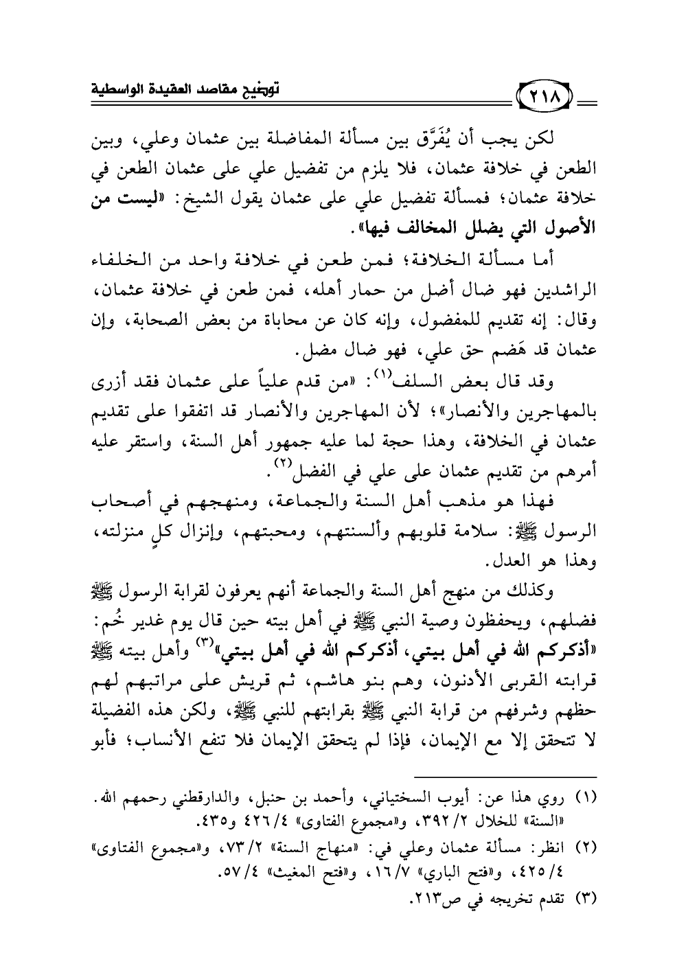 لكن يجب أن يُفَرَّق بين مسألة المفاضلة بين عثمان وعلي، وبين الطعن في خلافة عثمان، فلا يلزم من تفضيل علي على عثمان الطعن في خلافة عثمان؛ فمسألة تفضيل علي على عثمان يقول الشيخ: ليست من المسائل التي يضلل المخالف فيها.
