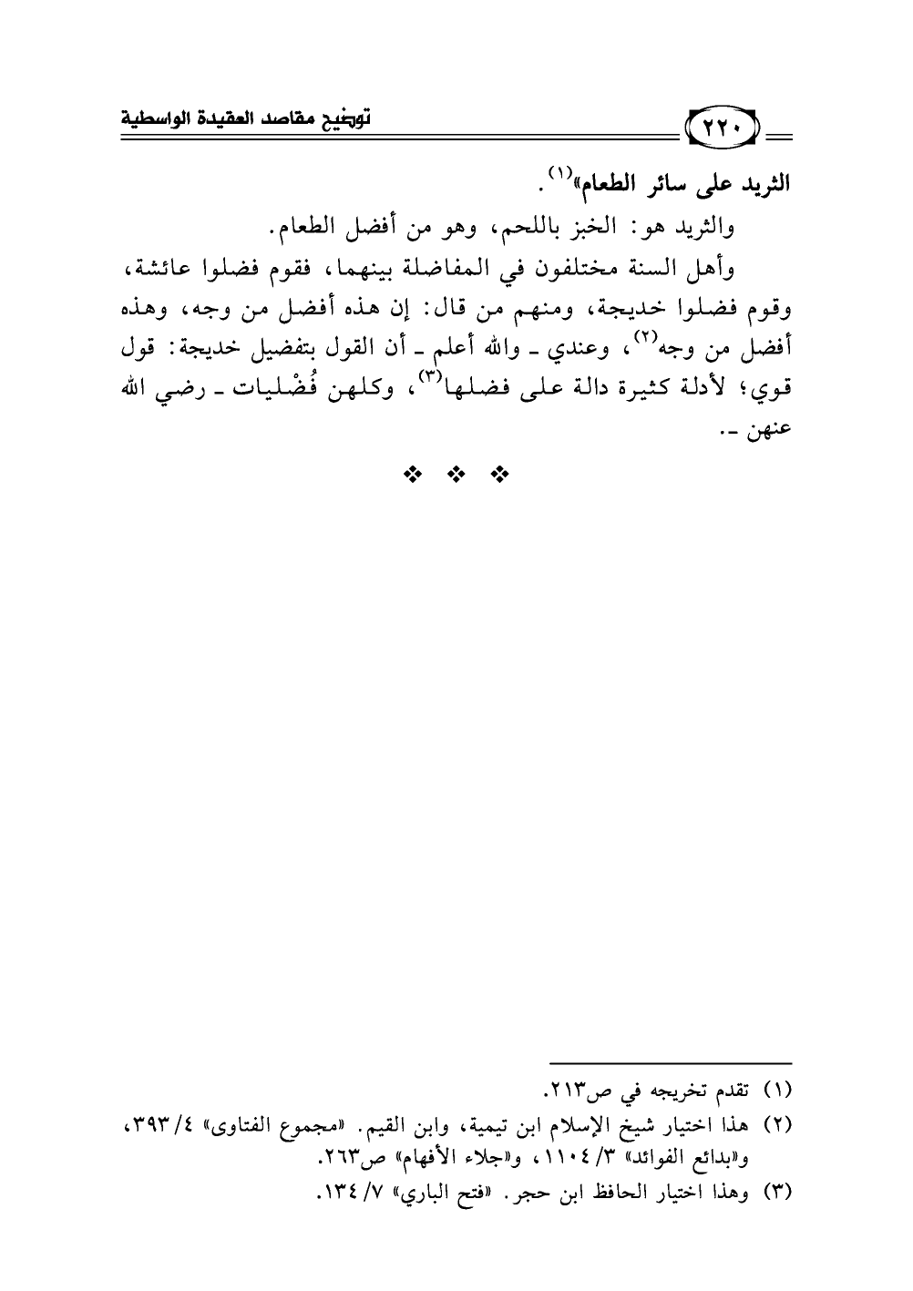 الثريد على سائر الطعام" (¬1). والثريد هو: الخبز باللحم، وهو من أفضل الطعام.