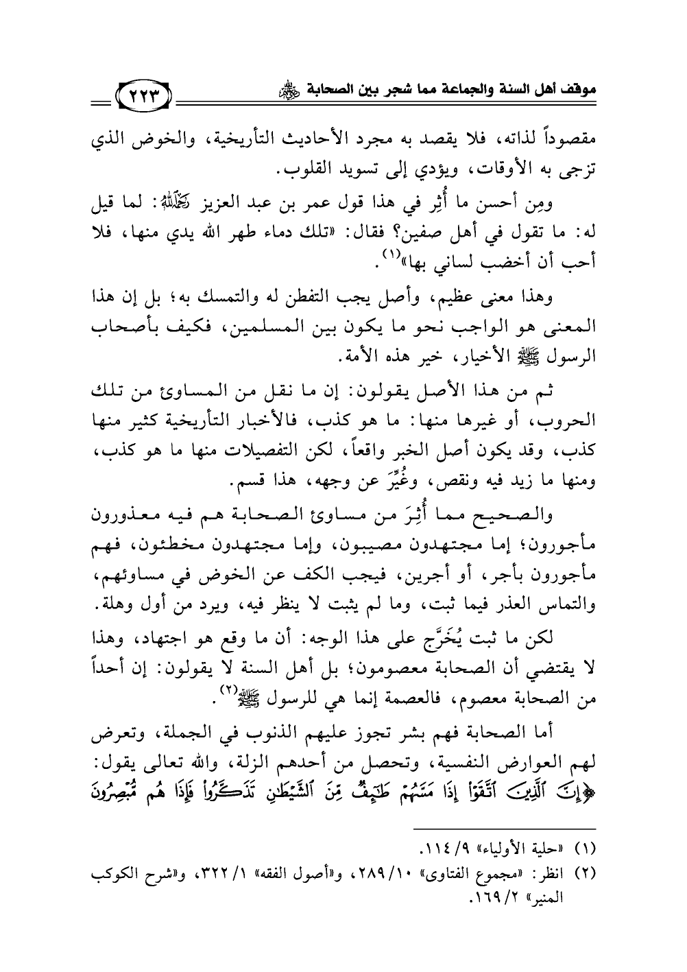 أما الصحابة فهم بشر تجوز عليهم الذنوب في الجملة، وتعرض لهم العوارض النفسية، وتحصل من أحدهم الزلة، والله تعالى يقول {إِنَّ الَّذِينَ اتَّقَوا إِذَا مَسَّهُمْ طَائِفٌ مِّنَ الشَّيْطَانِ تَذَكَّرُوا فَإِذَا هُم مُّبْصِرُونَ} [(201) سورة الأعراف]