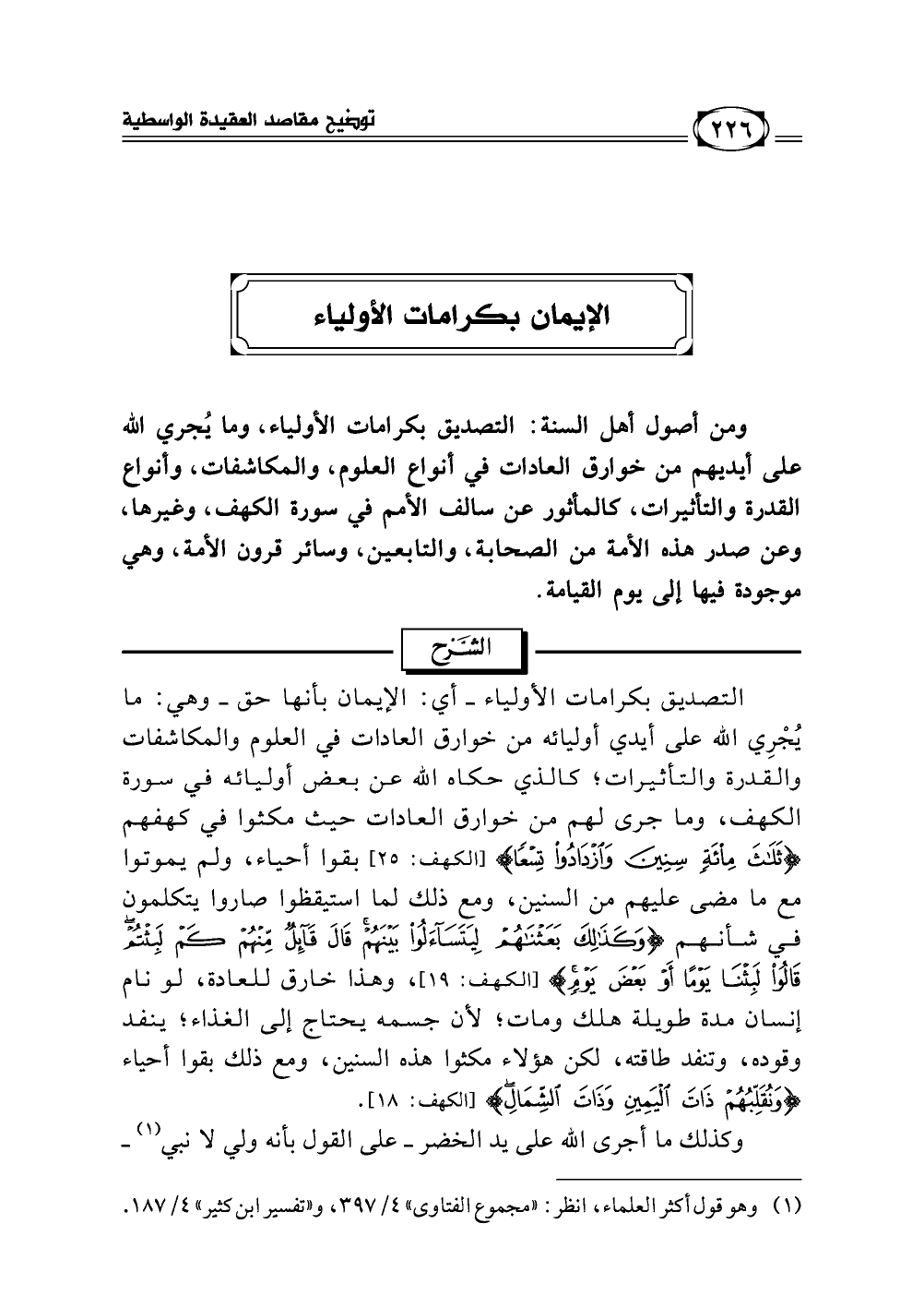 التصديق بكرامات الأولياء ـ أي: الإيمان بأنها حق ـ وهي: ما يُجْرِي الله على أيدي أوليائه من خوارق العادات في العلوم والمكاشفات والقدرة والتأثيرات؛ كالذي حكاه الله عن بعض أوليائه في سورة الكهف، وما جرى لهم من خوارق العادات حيث مكثوا في كهفهم {ثَلَاثَ مِائَةٍ سِنِينَ وَازْدَادُوا تِسْعًا} [(25) سورة الكهف] بقوا أحياء، ولم يموتوا مع ما مضى عليهم من السنين، ومع ذلك لما استيقظوا صاروا يتكلمون في شأنهم {وَكَذَلِكَ بَعَثْنَاهُمْ لِيَتَسَاءلُوا بَيْنَهُمْ قَالَ قَائِلٌ مِّنْهُمْ كَمْ لَبِثْتُمْ قَالُوا لَبِثْنَا يَوْمًا أَوْ بَعْضَ يَوْمٍ} [(19) سورة الكهف] وهذا خارق للعادة، لو نام إنسان مدة طويلة هلك ومات؛ لأن جسمه يحتاج إلى الغذاء؛ ينفد وقوده، وتنفد طاقته، لكن هؤلاء مكثوا هذه السنين، ومع ذلك بقوا أحياء {وَنُقَلِّبُهُمْ ذَاتَ الْيَمِينِ وَذَاتَ الشِّمَالِ} [(18) سورة الكهف].