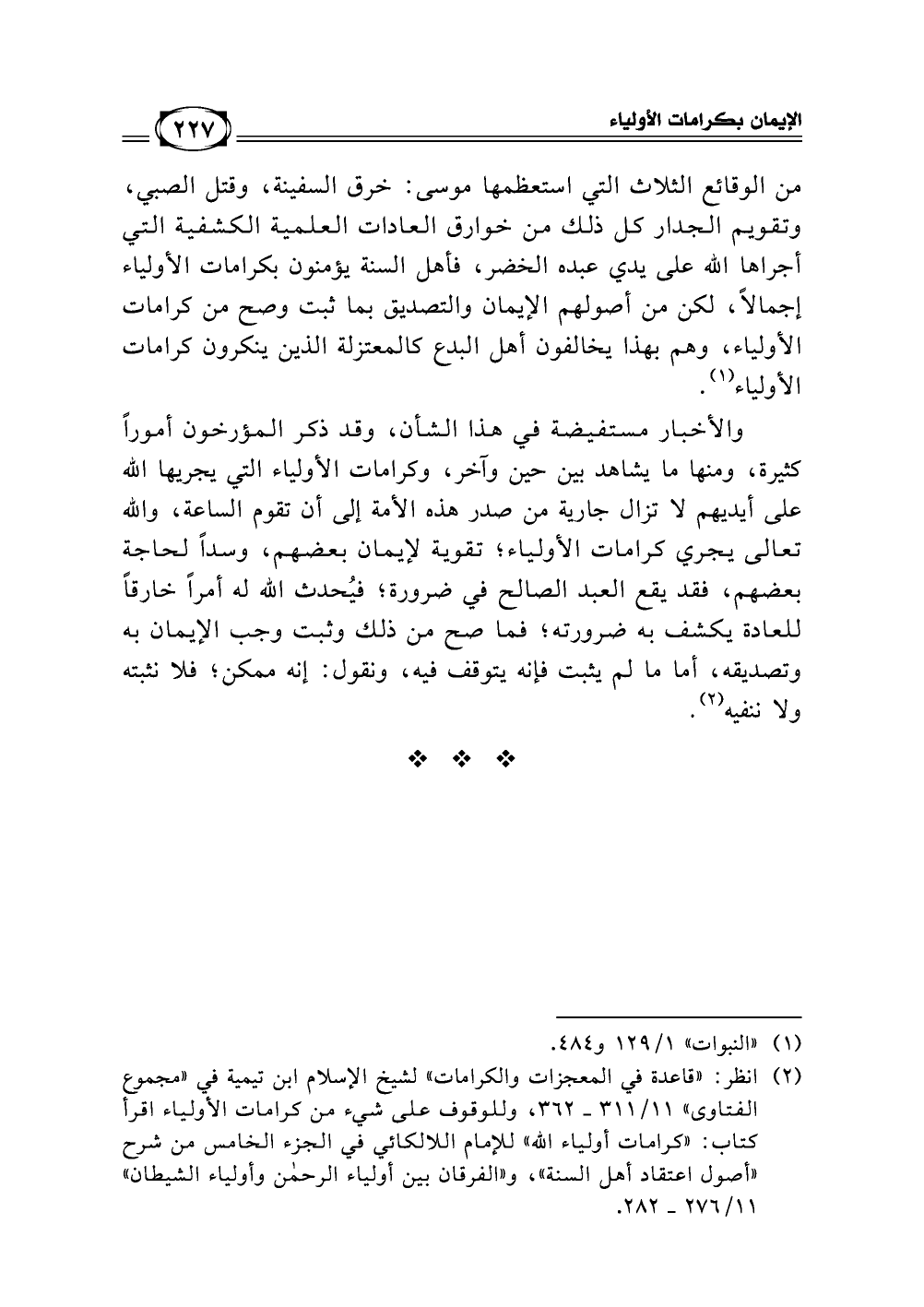 (¬2) [انظر: "قاعدة في المعجزات والكرامات" لشيخ الإسلام ابن تيمية في "مجموع الفتاوى" 11/ 311 ـ 362، وللوقوف على شيء من كرامات الأولياء= اقرأ كتاب: "كرامات الأولياء" للإمام اللالكائي، في الجزء الخامس من "شرح أصول اعتقاد أهل السنة"، و"الفرقان بين أولياء الرحمن وأولياء الشيطان"].