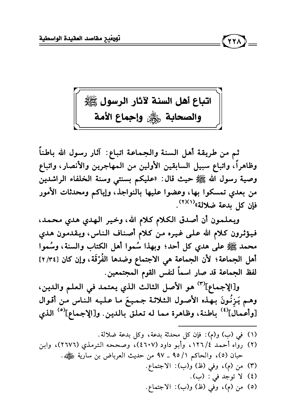 [اتباع أهل السنة لآثار الرسول - صلى الله عليه وسلم - والصحابة رضي الله عنهم وإجماع الأمة]