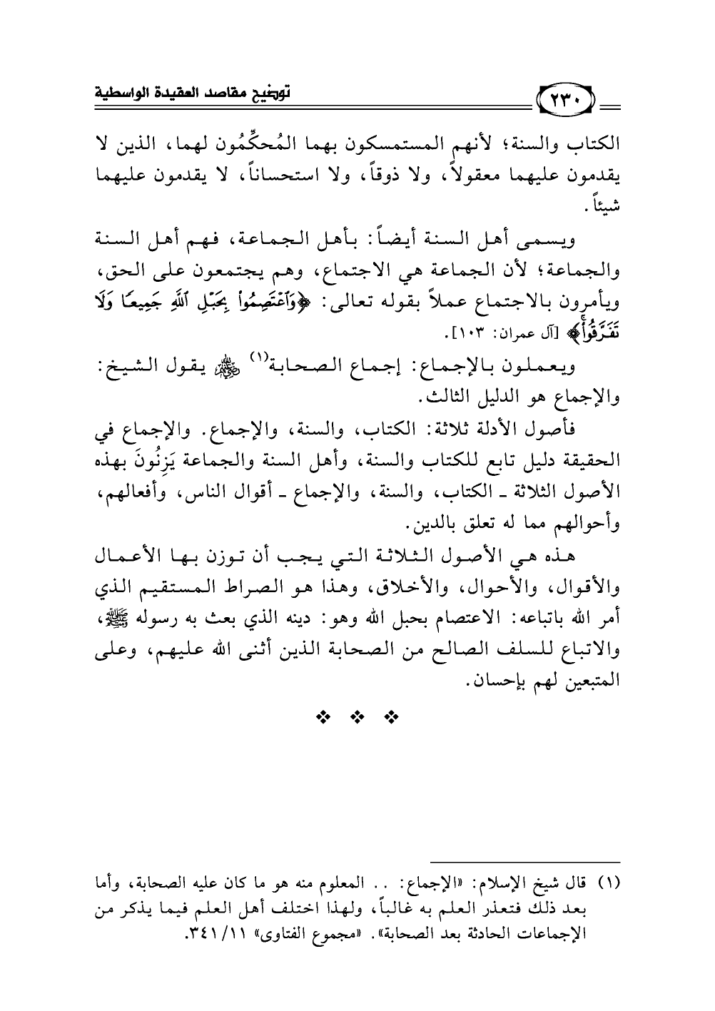 ويعملون بالإجماع: إجماع الصحابة (¬1) ـ رضي الله عنهم ـ يقول الشيخ: والإجماع هو الدليل الثالث.