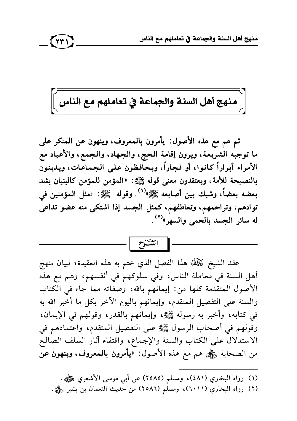 ثم هم مع هذه الأصول يأمرون بالمعروف، وينهون عن المنكر على ما توجبه الشريعة، ويرون إقامة الحج، والجهاد، والجمع، والأعياد مع الأمراء أبرارًا كانوا، أو فجارًا، ويحافظون على الجماعات، ويدينون بالنصيحة للأمة، ويعتقدون معنى قوله - صلى الله عليه وسلم -:"المؤمن للمؤمن كالبنيان يشد بعضه بعضًا، وشبك بين أصابعه" (¬1). وقوله - صلى الله عليه وسلم -:"مثل المؤمنين في توادهم، وتراحمهم، وتعاطفهم، كمثل الجسد إذا اشتكى منه عضو تداعى له سائر الجسد بالحمى والسهر" (¬2).