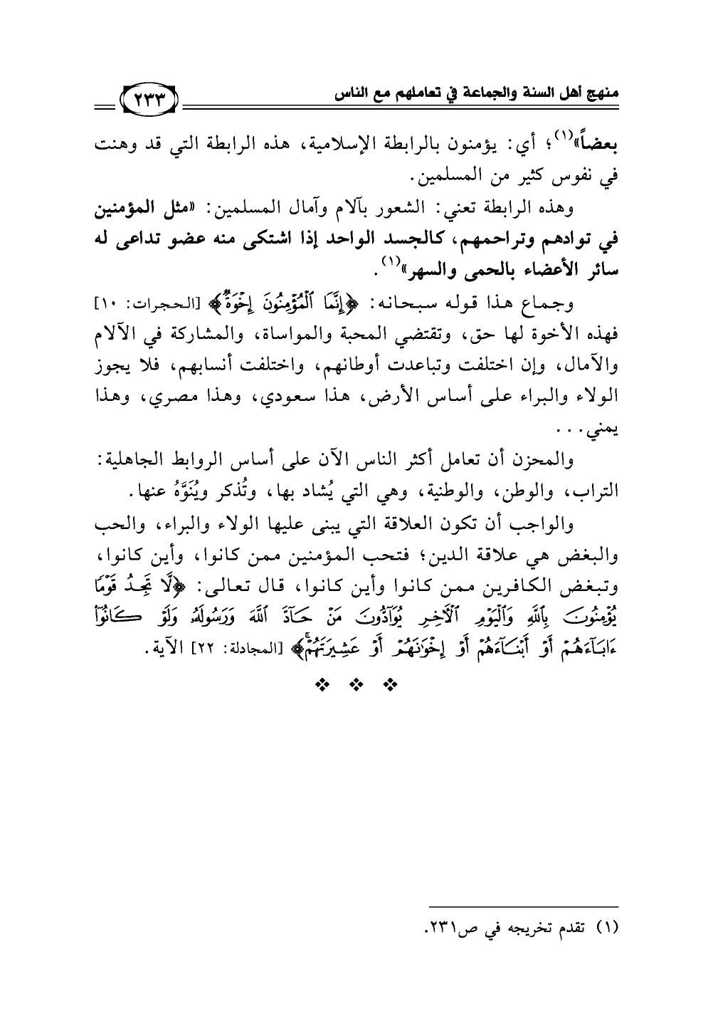 وجماع هذا قوله سبحانه: {إِنَّمَا الْمُؤْمِنُونَ إِخْوَةٌ} [(10) سورة الحجر] فهذه الأخوة لها حق، وتقتضي المحبة والمواساة، والمشاركة في الآلام والآمال، وإن اختلفت وتباعدت أوطانهم، واختلفت أنسابهم، فلا يجوز الولاء والبراء على أساس الأرض، هذا سعودي، وهذا مصري، وهذا يمني ..