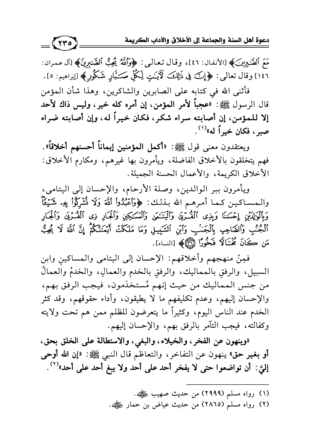 "ويعتقدون معنى قول - صلى الله عليه وسلم -:"أكمل المؤمنين إيمانًا أحسنهم أخلاقًا". فهم يتخلقون بالأخلاق الفاضلة، ويأمرون بها غيرهم، ومكارم الأخلاق: الأخلاق الكريمة، والأعمال الحسنة الجميلة.