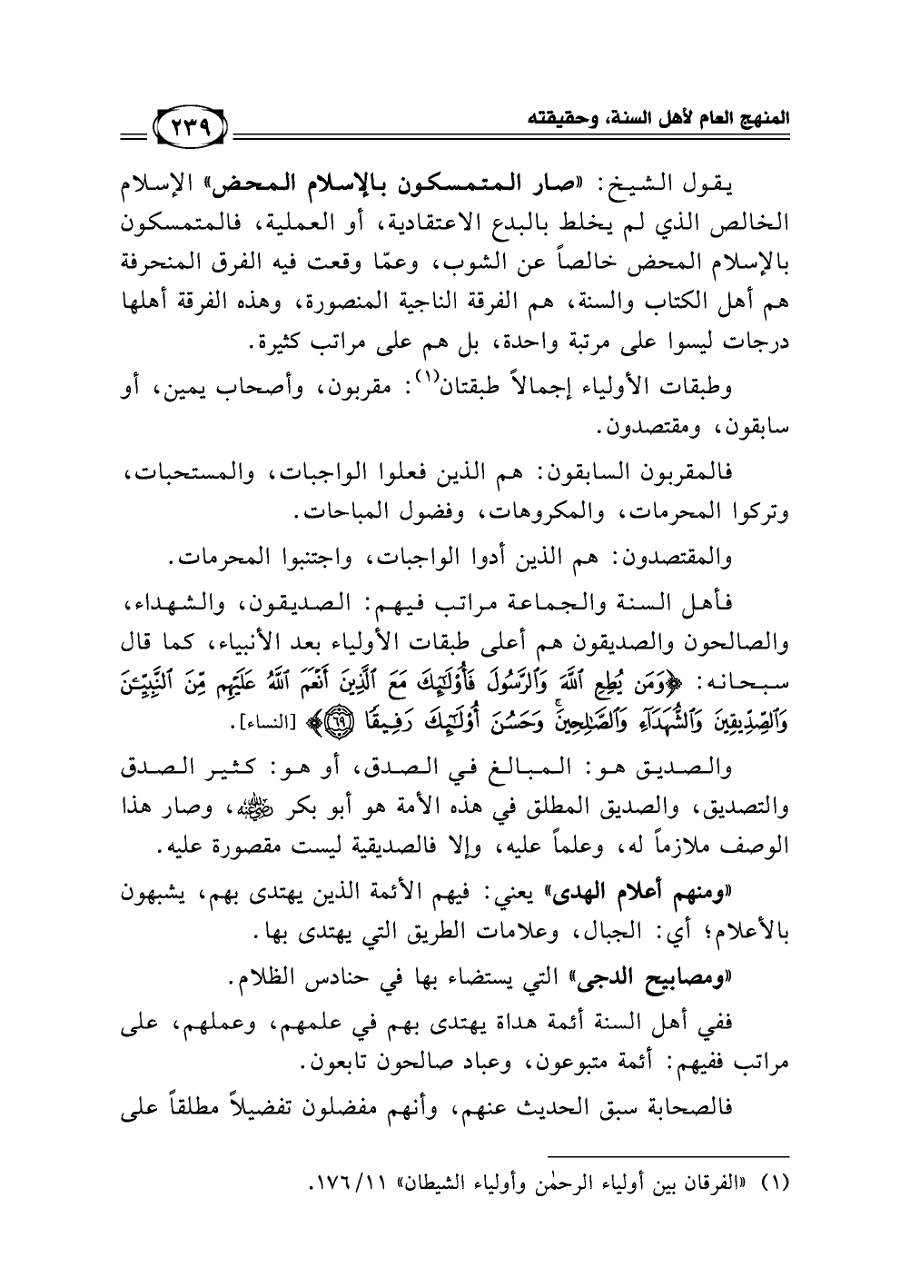 يقول الشيخ:"صار المتمسكون بالإسلام المحض" الإسلام الخالص الذي لم يخلط بالبدع الاعتقادية أو العملية، فالمتمسكون بالإسلام المحض خالصًا عن الشوب، وعمّا وقعت فيه الفرق المنحرفة هم أهل الكتاب والسنة، هم الفرقة الناجية المنصورة، وهذه الفرقة أهلها درجات ليسوا على مرتبة واحدة، بل هم على مراتب كثيرة، طبقات الأولياء إجمالا طبقتان (¬1): مقربون، وأصحاب يمين، أو سابقون، ومقتصدون.