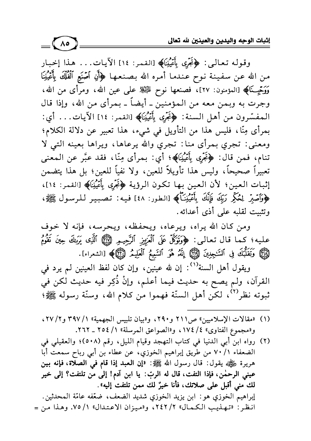 وقوله تعالى: {تَجْرِي بِأَعْيُنِنَا} الآيات .. هذا إخبار من الله عن سفينة نوح عندما أمره الله بصنعها {أَنِ اصْنَعِ الْفُلْكَ بِأَعْيُنِنَا وَوَحْيِنَا}، فصنعها نوح عليه السلام على عين الله، ومرأى من الله، وجرت به، وبمن معه من المؤمنين أيضا بمرأى من الله، وإذا قال المفسرون من أهل السنة {تَجْرِي بِأَعْيُنِنَا} الآيات .. أي: بمرأى مِنّا، فليس هذا من التأويل في شيء، هذا تعبير عن دلالة الكلام، ومعنى: تجري بمرأى منا: تجري والله يرعاها، ويراها بعينه التي لا تنام، فمن قال: {تَجْرِي بِأَعْيُنِنَا} أي: بمراى مِنّا فقد عبَّر عن المعنى تعبيرًا صحيحًا، وليس هذا تأويلا للعين، ولا نفيا للعين؛ بل هذا يتضمن إثبات العين؛ لأن العين بها تكون الرؤية {تَجْرِي بِأَعْيُنِنَا} {وَاصْبِرْ لِحُكْمِ رَبِّكَ فَإِنَّكَ بِأَعْيُنِنَا} فيه تصبير للرسول - صلى الله عليه وسلم -، وتثبيت لقلبه على أذى أعدائه.