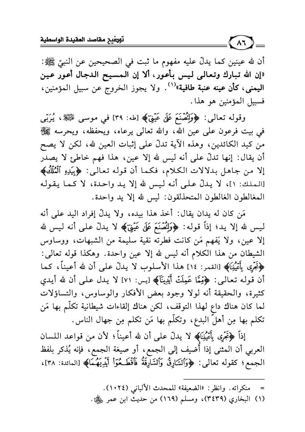 وقوله تعالى {وَلِتُصْنَعَ عَلَى عَيْنِي} في موسى عليه السلام يُرَبّى في بيت فرعون على عين الله، والله تعالى يرعاه، ويحفظه، ويحرسه سبحانه وتعالى من كيد الكائدين، وهذه الآية تدل على إثبات العين لله، لكن لا يصح أن يقال: إنها تدل على أنه ليس لله إلا عين، هذا فهم خاطئ لا يصدر إلا من جاهل بدلالات الكلام، فكما أن قوله تعالى {بِيَدِهِ الْمُلْكُ} لا يدل على أنه ليس لله إلا يد واحدة، لا كما يقوله المغالطون الغالطون المتحذلقون: ليس لله إلا يد واحدة.