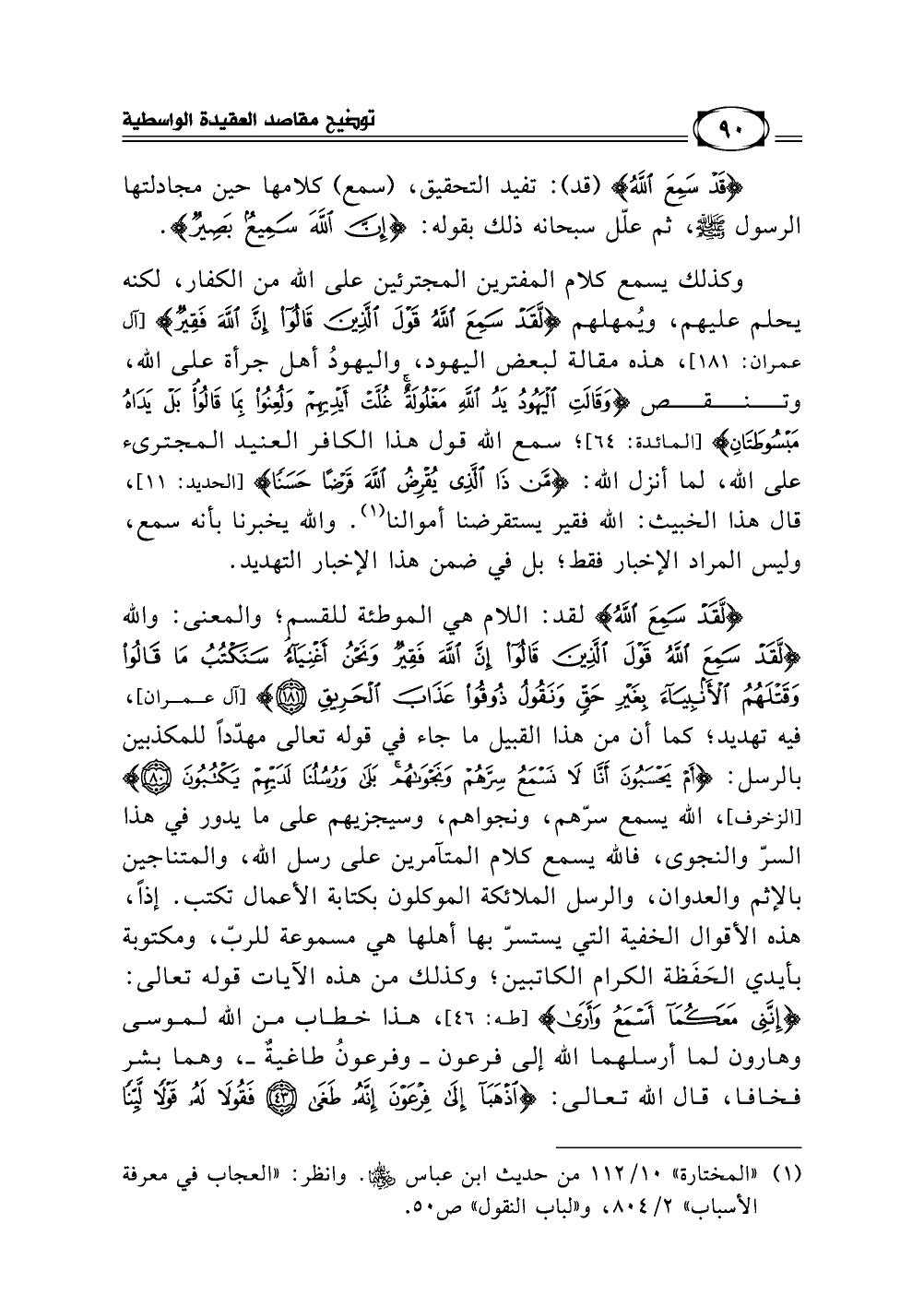 وكذلك يسمع كلام المفترين المجترئين على الله من الكفار، لكنه يحلم عليهم ويمهلهم {لَقَدْ سَمِعَ اللَّهُ قَوْلَ الَّذِينَ قَالُوا إِنَّ اللَّهَ فَقِيرٌ} هذه مقالة لبعض اليهودِ، واليهودُ أهل جرأة على الله وتنقص {وَقَالَتِ الْيَهُودُ يَدُ اللَّهِ مَغْلُولَةٌ غُلَّتْ أَيْدِيهِمْ وَلُعِنُوا بِمَا قَالُوا بَلْ يَدَاهُ مَبْسُوطَتَانِ} سمع الله قول هذا الكافر العنيد المجترئ على الله، لما أنزل الله {مَنْ ذَا الَّذِي يُقْرِضُ اللَّهَ قَرْضًا حَسَنًا} قال هذا الخبيث: الله فقير يستقرضنا أموالنا (¬1). والله يخبرنا بأنه سمع، وليس المراد الإخبار فقط، بل في ضمن هذا الإخبار التهديد.