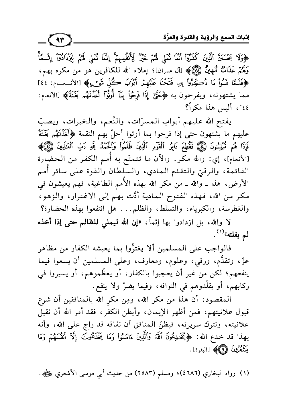 يفتح الله عليهم أبواب المسرات، والنعم، والخيرات، ويصب عليهم ما يشتهون حتى إذا فرحوا بما أوتوا أحل بهم النقمة {أَخَذْنَاهُمْ بَغْتَةً فَإِذَا هُمْ مُبْلِسُونَ * فَقُطِعَ دَابِرُ الْقَوْمِ الَّذِينَ ظَلَمُوا وَالْحَمْدُ لِلَّهِ رَبِّ الْعَالَمِينَ} [(44 - 45) سورة الأنعام] إي والله مكر، والآن ما تتمتع به أمم الكفر من الحضارة القائمة، والرقي والتقدم المادي، والسلطان والقوة على سائر أمم الأرض، هذا ـ والله ـ من مكر الله بهذه الأمم الطاغية، فهم يعيشون في مكر من الله، فهذه الفتوح المادية أدت بهم إلى الاغترار، والزهو، والغطرسة، والكبرياء، والتسلط، والظلم .. هل انتفعوا بهذه الحضارة؟
