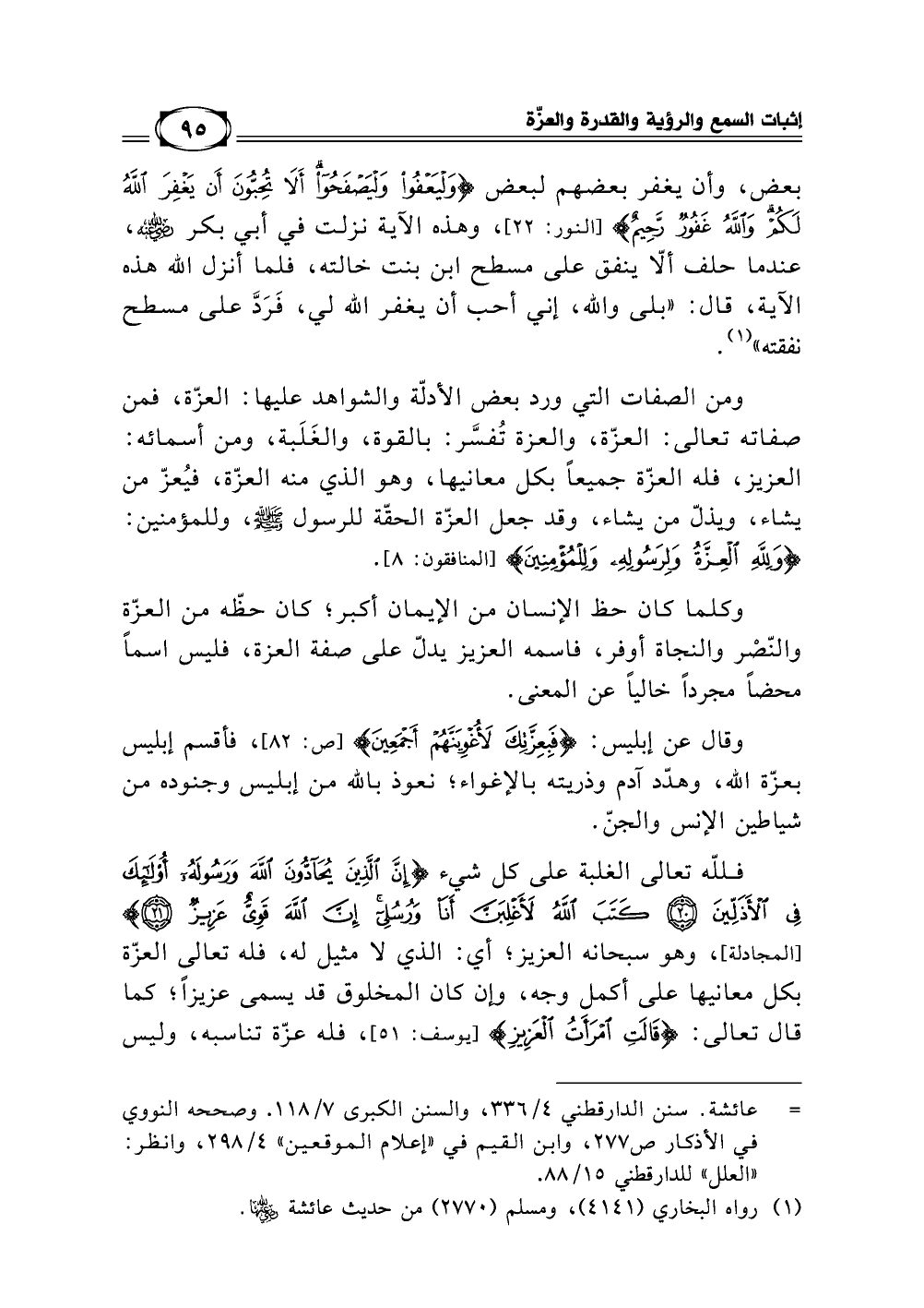 ومن الصفات التي ورد بعض الأدلة، والشواهد عليها العزة، فمن صفاته تعالى العزة، والعزة تفسر: بالقوة، والغلبة، ومن أسمائه العزيز، فله العزة جميعا بكل معانيها، وهو الذي منه العزة، فيعز من يشاء، ويذل من يشاء، وقد جعل العزة الحقة للرسول - صلى الله عليه وسلم -، وللمؤمنين، {وَلِلَّهِ الْعِزَّةُ وَلِرَسُولِهِ وَلِلْمُؤْمِنِينَ} [(8) سورة المنافقون].