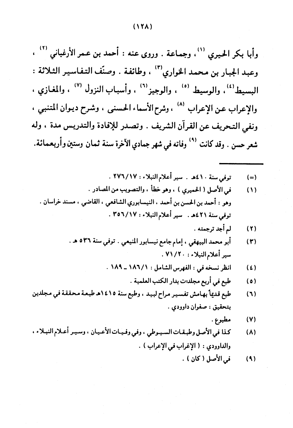 وصنف التفاسير الثَّلَاثَة الْبَسِيط والوسيط وَالْوَجِيز وَأَسْبَاب النُّزُول والمغازي وَالْإِعْرَاب عَن الْإِعْرَاب وَشرح الْأَسْمَاء الْحسنى وَشرح ديوَان المتنبي وَنفي التحريف عَن الْقُرْآن الشريف