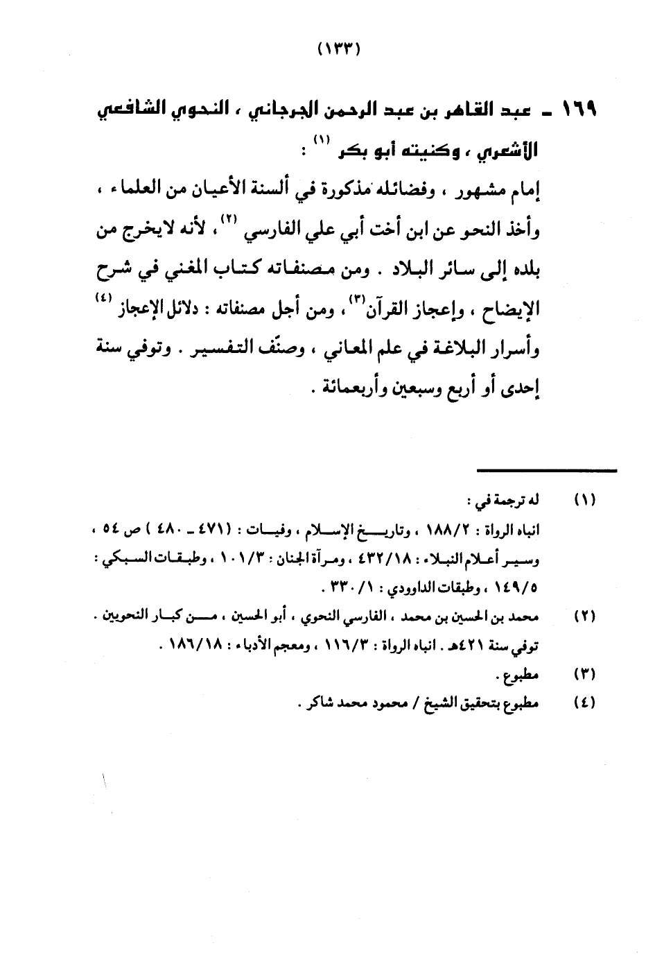 169 - عبد القاهر بن عبد الرَّحْمَن الْجِرْجَانِيّ النَّحْوِيّ الشَّافِعِي الْأَشْعَرِيّ وكنيته أَبُو بكر