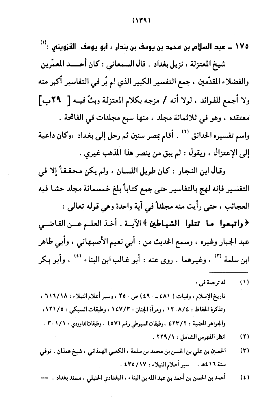 وَقَالَ ابْن النجار كَانَ طَوِيل اللِّسَان وَلم يكن محققا إِلَّا فِي التَّفْسِير فَإِنَّهُ لهج بالتفاسير حَتَّى جمع كتابا بلغ خَمْسمِائَة مُجَلد حَشا فِيهِ الْعَجَائِب حَتَّى رَأَيْت مِنْهُ مجلدا فِي آيَة وَاحِدَة وَهِي قَوْله تَعَالَى {وَاتبعُوا مَا تتلوا الشَّيَاطِين} الْآيَة