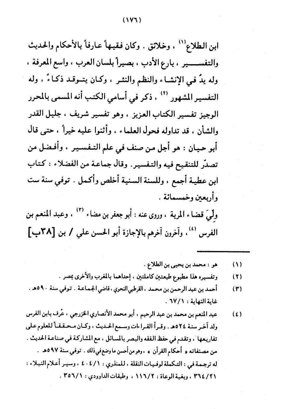 وَكَانَ فَقِيها عَارِفًا بِالْأَحْكَامِ والْحَدِيث وَالتَّفْسِير بارع الْأَدَب بَصيرًا بِلِسَان الْعَرَب وَاسع الْمعرفَة وَله يَد فِي الْإِنْشَاء وَالنّظم والنثر وَكَانَ يتوقد ذكاء وَله التَّفْسِير الْمَشْهُور ذكر فِي أسامي الْكتب أَنه الْمُسَمّى بالمحرر الْوَجِيز تَفْسِير الْكتاب الْعَزِيز وَهُوَ تَفْسِير شرِيف جليل الْقدر والشأن قد تداوله فحول الْعلمَاء وأثنوا عَلَيْهِ خيرا حَتَّى قَالَ أَبُو حَيَّان هُوَ أجل من صنف فِي علم التَّفْسِير وَأفضل من تصدر للتنقيح فِيهِ وَالتَّفْسِير