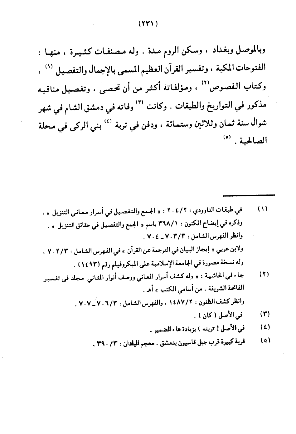 وَله مصنفات كَثِيرَة مِنْهَا الفتوحات المكية وَتَفْسِير الْقُرْآن الْعَظِيم الْمُسَمّى بالإجمال وَالتَّفْصِيل وَكتاب الفصوص ومؤلفاته أَكثر من أَن تحصى وتفصيل مناقبه مَذْكُور فِي التواريخ والطبقات