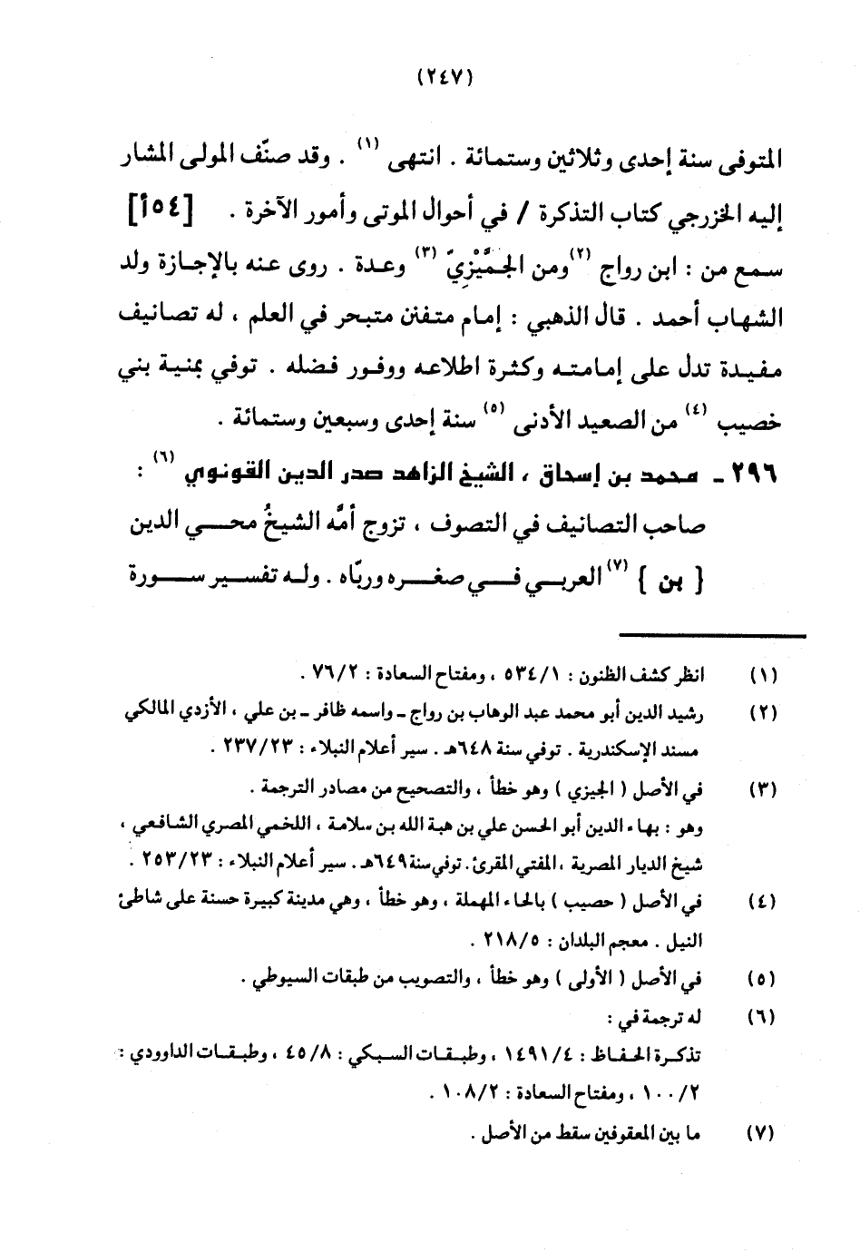 296 - مُحَمَّد بن إِسْحَاق الشَّيْخ الزَّاهِد صدر الدّين القونوي صَاحب التصانيف فِي التصوف تزوج أمه الشَّيْخ مُحي الدّين بن الْعَرَبِيّ فِي صغره ورباه