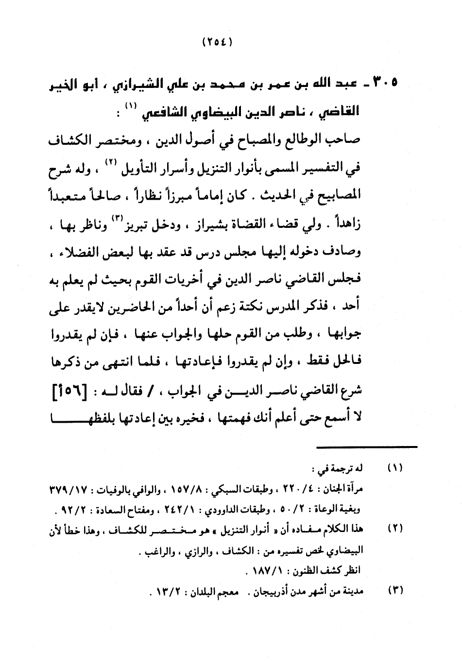 305 - عبد الله بن عمر بن مُحَمَّد بن عَليّ الشِّيرَازِيّ أَبُو الْخَيْر القَاضِي نَاصِر الدّين الْبَيْضَاوِيّ الشَّافِعِي