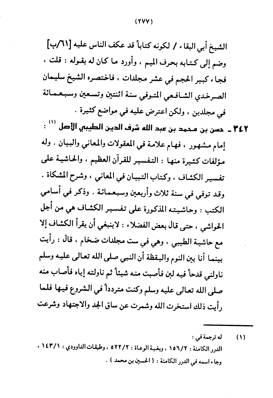 وَذكر فِي أسامي الْكتب وحاشيته الْمَذْكُورَة على تَفْسِير الْكَشَّاف هِيَ من أجل الْحَوَاشِي حَتَّى قَالَ بعض الْفُضَلَاء لَا يَنْبَغِي أَن يقْرَأ الْكَشَّاف إِلَّا مَعَ حَاشِيَة الطَّيِّبِيّ وَهِي فِي سِتّ مجلدات ضخام قَالَ رَأَيْت بَيْنَمَا أَنا بَين النّوم واليقظة أَن النَّبِي صلى الله عَلَيْهِ وَسلم ناولني قدحا فِيهِ لبن فَأَصَبْت مِنْهُ شَيْئا ثمَّ ناولته إِيَّاه فَأصَاب مِنْهُ صلى تَعَالَى عَلَيْهِ وَسلم وَكنت مترددا فِي الشُّرُوع فِيهَا فَلَمَّا رَأَيْت ذَلِك استخرت الله وشمرت عَن سَاق الْجد وَالِاجْتِهَاد وشرعت