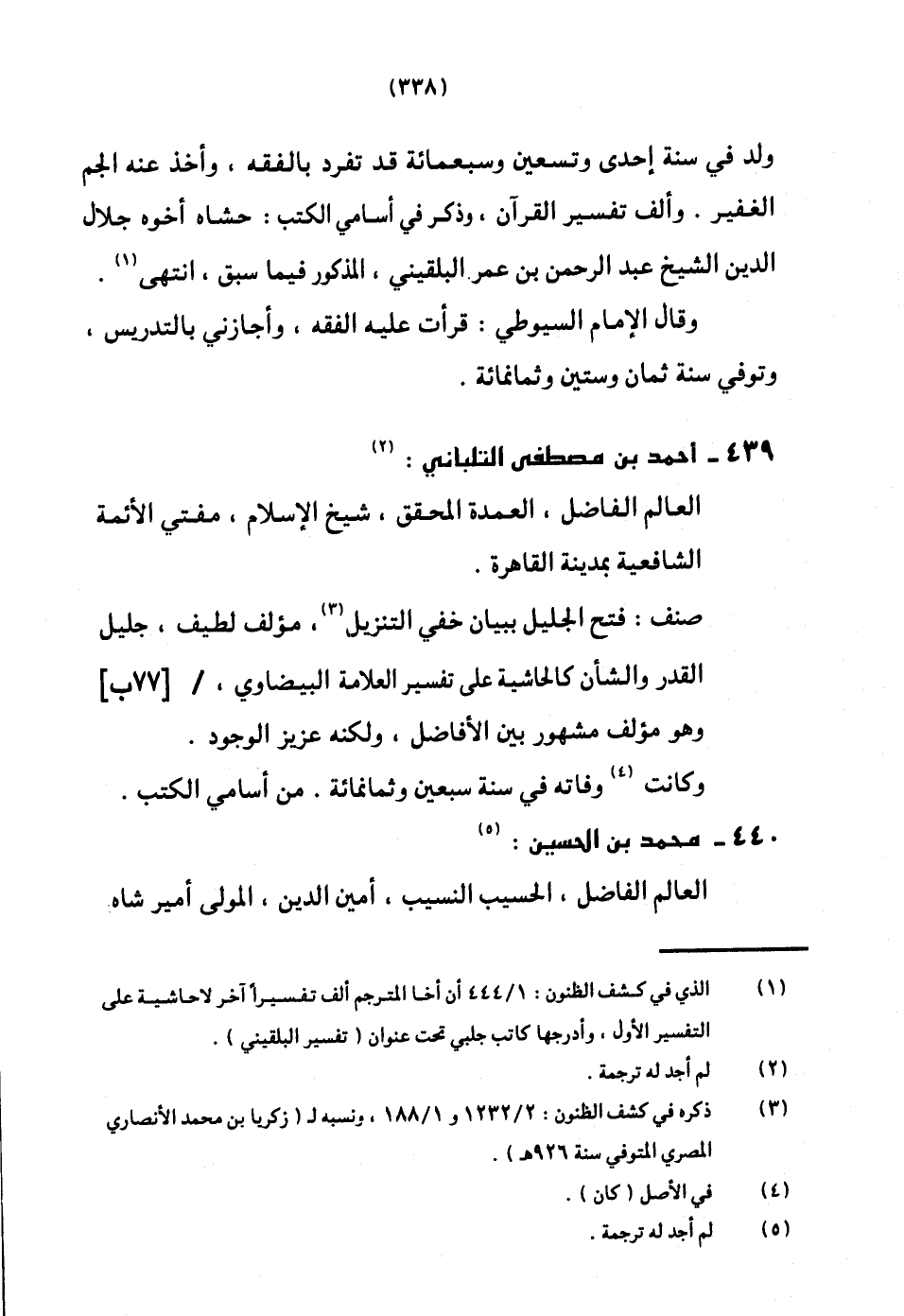 صنف فتح الْجَلِيل بِبَيَان خَفِي التَّنْزِيل مؤلف لطيف جليل الْقدر والشأن كالحاشية على تَفْسِير الْعَلامَة الْبَيْضَاوِيّ [77 ب] وَهُوَ مؤلف مَشْهُور بَين الأفاضل وَلكنه عَزِيز الْوُجُود