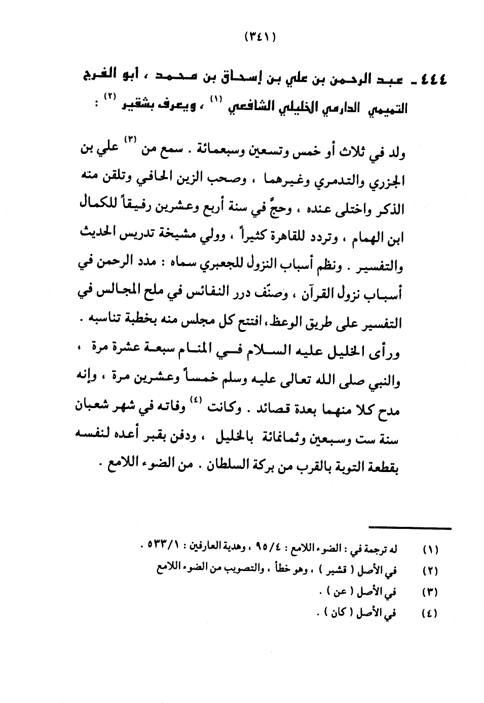 444 - عبد الرَّحْمَن بن عَليّ بن إِسْحَاق بن مُحَمَّد أَبُو الْفرج التَّمِيمِي الدَّارمِيّ الخليلي الشَّافِعِي وَيعرف بشقير