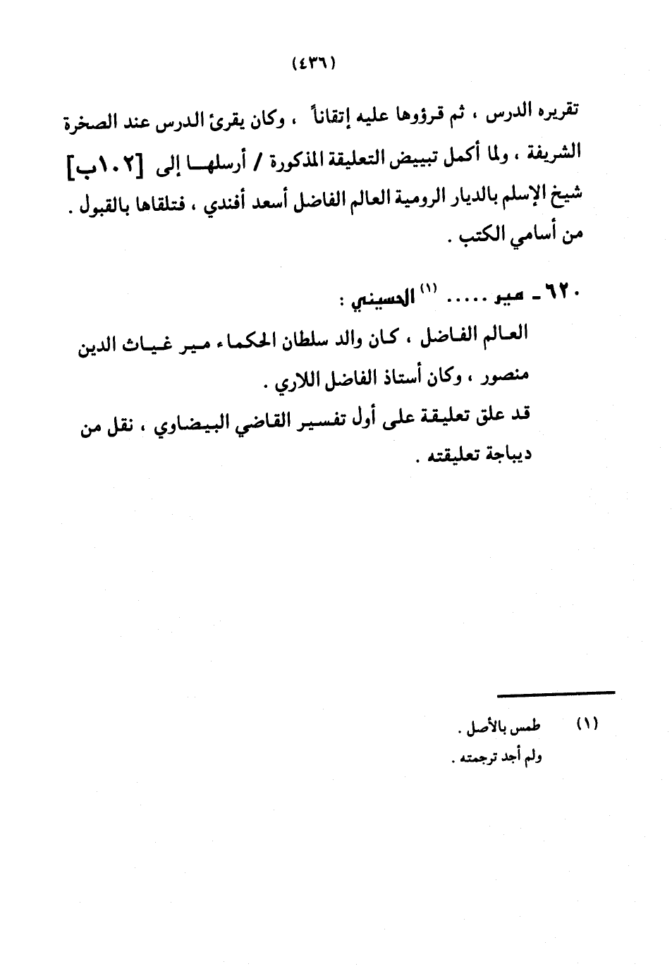تَقْرِيره الدَّرْس ثمَّ قرؤوها عَلَيْهِ إتقانا وَكَانَ يقرىء الدَّرْس عِنْد الصَّخْرَة الشَّرِيفَة وَلما أكمل تبييض التعليقة الْمَذْكُورَة أرسلها إِلَى 102 ب شيخ الْإِسْلَام بالديار الرومية الْعَالم الْفَاضِل أسعد أَفَنْدِي فتلقاها بِالْقبُولِ