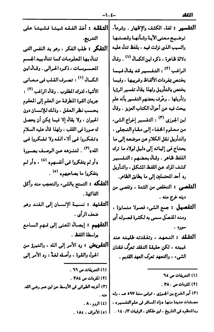 التفسير: لغة، الكشف والإظهار. وشرعا توضيح معنى الآية وشأنها وقصتها والسبب الذي نزلت فيه، بلفظ يدل عليه دلالة ظاهره، ذكره ابن الكمال1. وقال الراغب2: التفسير قد يقال فيما يختص بمفردات الألفاظ وغريبها، وفيما يختص بالتأويل ولهذا يقال تفسير الرؤيا وتأويلها. وعرف بعضهم التفسير بأنه علم يبحث فيه عن أحوال الكتاب العزيز. وقال ابن الجوزي3: التفسير إخراج الشيء من معلوم الخفاء إلى مقام التجلي، والتأويل نقل الكلام عن موضعه إلى ما يحتاج في إثباته إلى دليل لولاه ما ترك اللفظ ظاهر. وقال بعضهم: التفسير كشف المراد عن اللفظ المشكل، والتأويل رد أحد المحتملين إلى ما يطابق الظاهر.