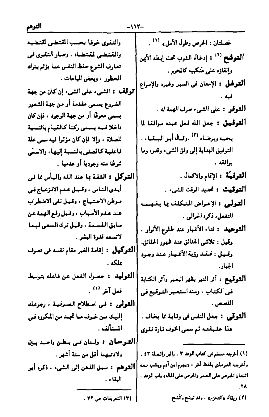التوقي: جعل النفس في وقاية مما يخاف، هذا حقيقته ثم يسمى الخوف تارة تقوى والتقوى خوفا بحسب المقتضى لمقتضيه والمقتضي لمقتضاه، وصار التقوى في تعارف الشرع حفظ النفس عما يؤثم بترك المحظور وبعض المباحات. توقف: الشيء على الشيء إن كان من جهة الشروع يسمى مقدمة ومن جهة الشعور يسمى معرفا أو من جهة الوجود. فإن كان داخلا فيه سمي ركنا كالقيام بالنسبة للصلاة، وإلا فإن كان مؤثرا فيه سمي علة فاعلية كالمصلي بالنسبة إليها، والاسمى شرطا فيه وجوبا أو عدميا.