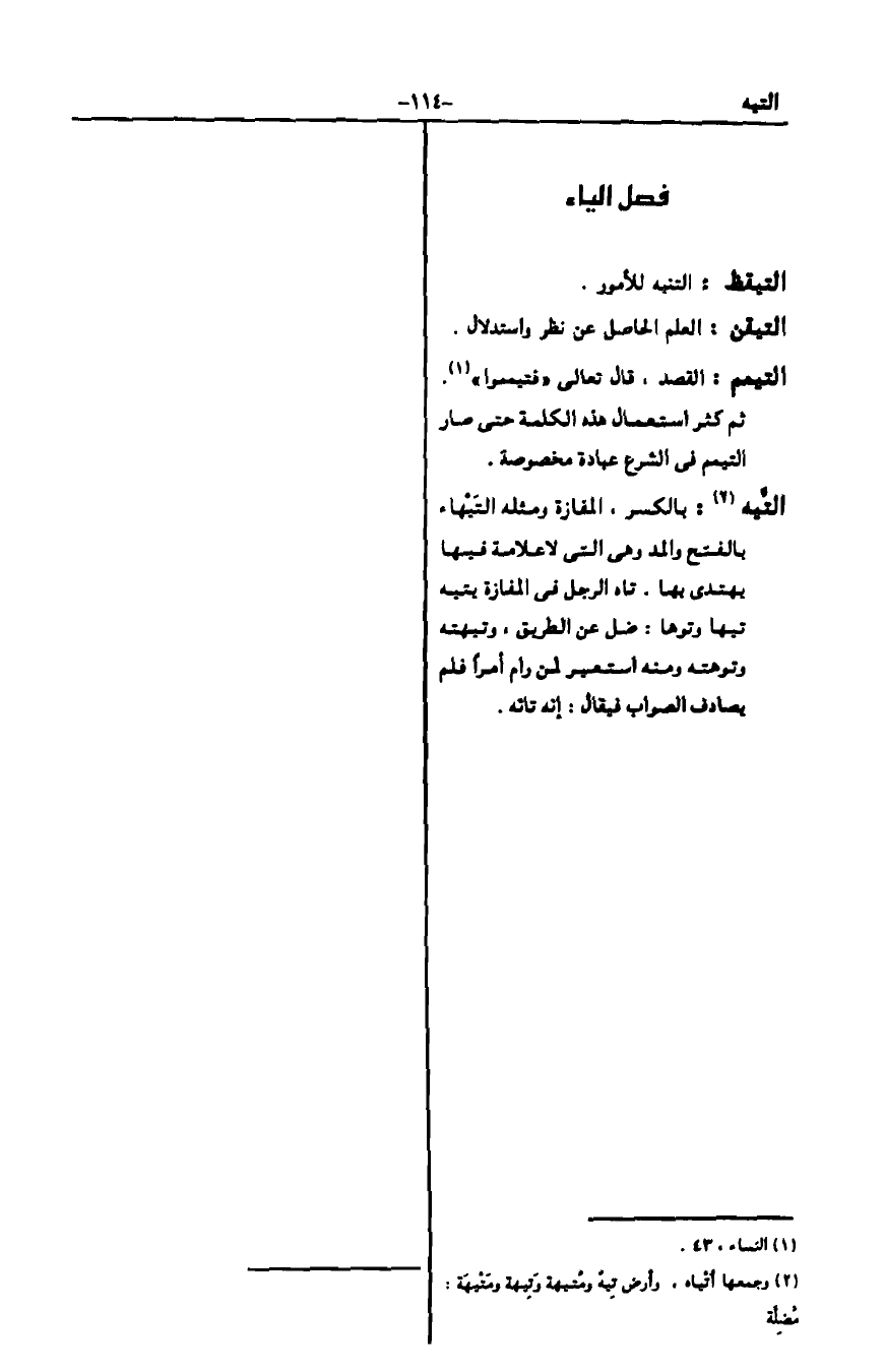 التيه2: بالكسر، المفازه ومنها التيهاء بالفتح والمد وهي التي لا علامة فيها يهتدى بها. وتاه الرجل في المفازة يتيه تيها وتوها ضل عن الطريق، وتيهته وتوهته ومنه استعير لمن رام أمرا فلم يصادف الصواب فيقال: إنه تائه.