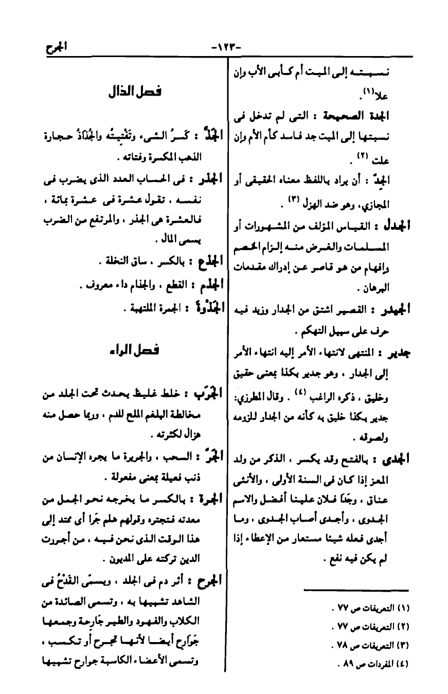 الجرح: أثر دم في الجلد، ويسمى القدح في الشاهد جرحا تشبيها به، وتسمى الصائدة من الكلاب والفهود والطير جارحة وجمعها جوارح أيضًا لأنها تجرح أو تكسب، وتسمى الأعضاء الكاسبة جوارح تشبيها