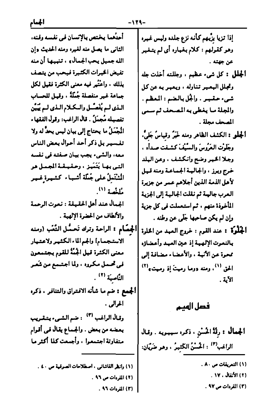 الجمال: رقة الحسن، ذكره سيبويه. وقال الراغب1: الحسن الكثير، وهو ضربان: أحدهما يختص بالإنسان في نفسه وفنه، الثاني ما يصل منه لغيره ومنه الحديث "إن الله جميل يحب الجمال" تنبيها أن منه تفيض الخيرات الكثيرة فيحب من يتصف بذلك، واعتبر فيه معنى الكثرة فقيل لكل جماعة غير منفصلة جملة، وقيل للحساب الذي لم يفصل والكلام الذي لم يبين تفصيله مجمل. قال الراغب: وقول الفقهاء المجمل ما يحتاج إلى بيان ليس بحد له ولا تفسير بل ذكر أحد أحوال بعض الناس معه، والشيء يجب بيان صفته في نفسه التي بها يتميز، وحقيقة المجمل هو المشتمل على جملة أشياء كثيرة غير ملخصة2.