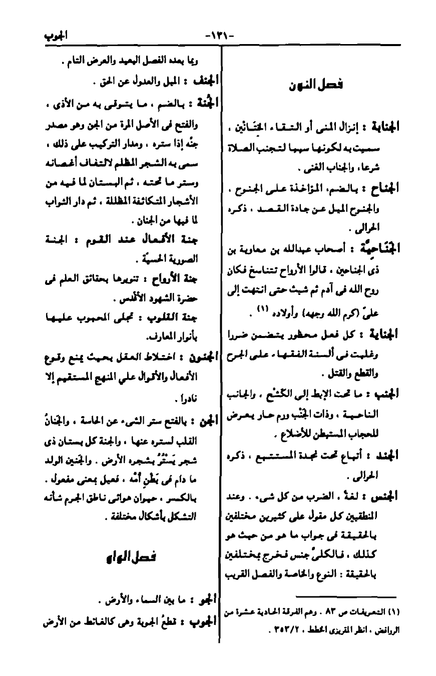 الجن: بالفتح ستر الشيء عن الحاسة، والجنان القلب لستره عنها، والجنة كل بستان ذي شجر يستر بشجره الأرض. والجنين الولد ما دام في بطن أمه، فعيل بمعنى مفعول.