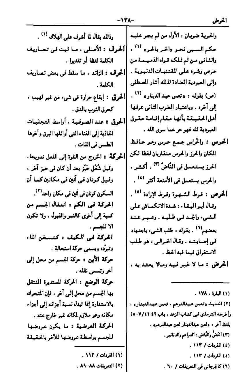 والحرية ضربان: الأول من لم يجر عليه حكم السبي نحو {الْحُرُّ بِالْحُر} 1. والثاني من لم تملكه قواه الذميمة من حرص وشره على المقتنيات الدنيوية. وإلى العبودية المضادة لذلك أشار المصطفى صلى الله عليه وسلم بقوله: "تعس عبد الدينار".2 إلى آخره. وباعتبار الضرب الثاني عرفها أهل الحقيقة بأنها مقام إقامة حقوق العبودية لله. فهو حر عما سوى الله.