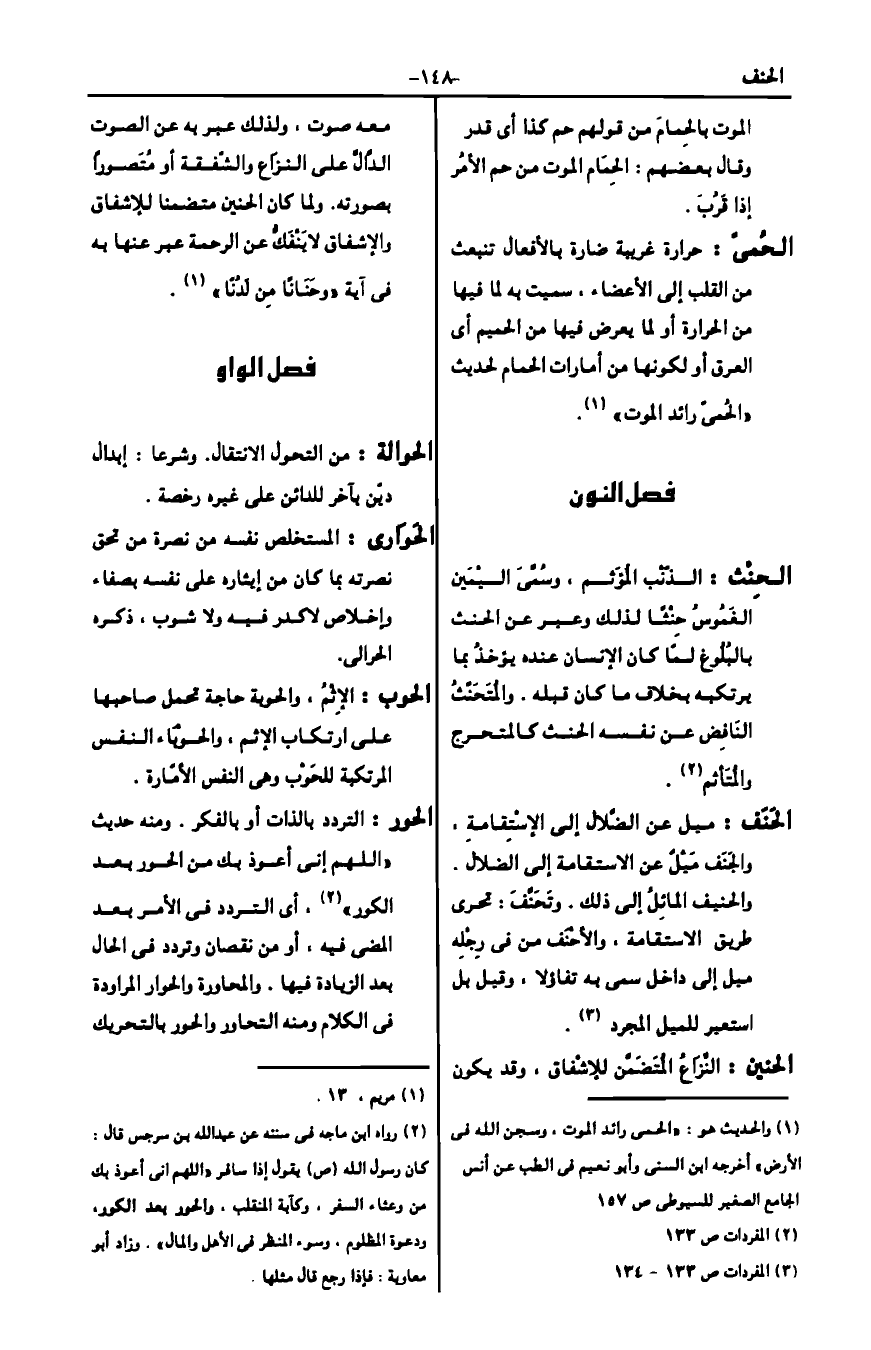 الحنين: النزاع المتضمن للإشفاق، وقد يكون معه صوت، ولذلك عبر به عن الصوت الدال على النزاع والشفقة أو متصورا بصورته. ولما كان الحنين متضمنا للإشفاق والإشفاق لا ينفك عن الرحمة عبر عنها به في آية {وَحَنَانًا مِنْ لَدُنَّا} 3.