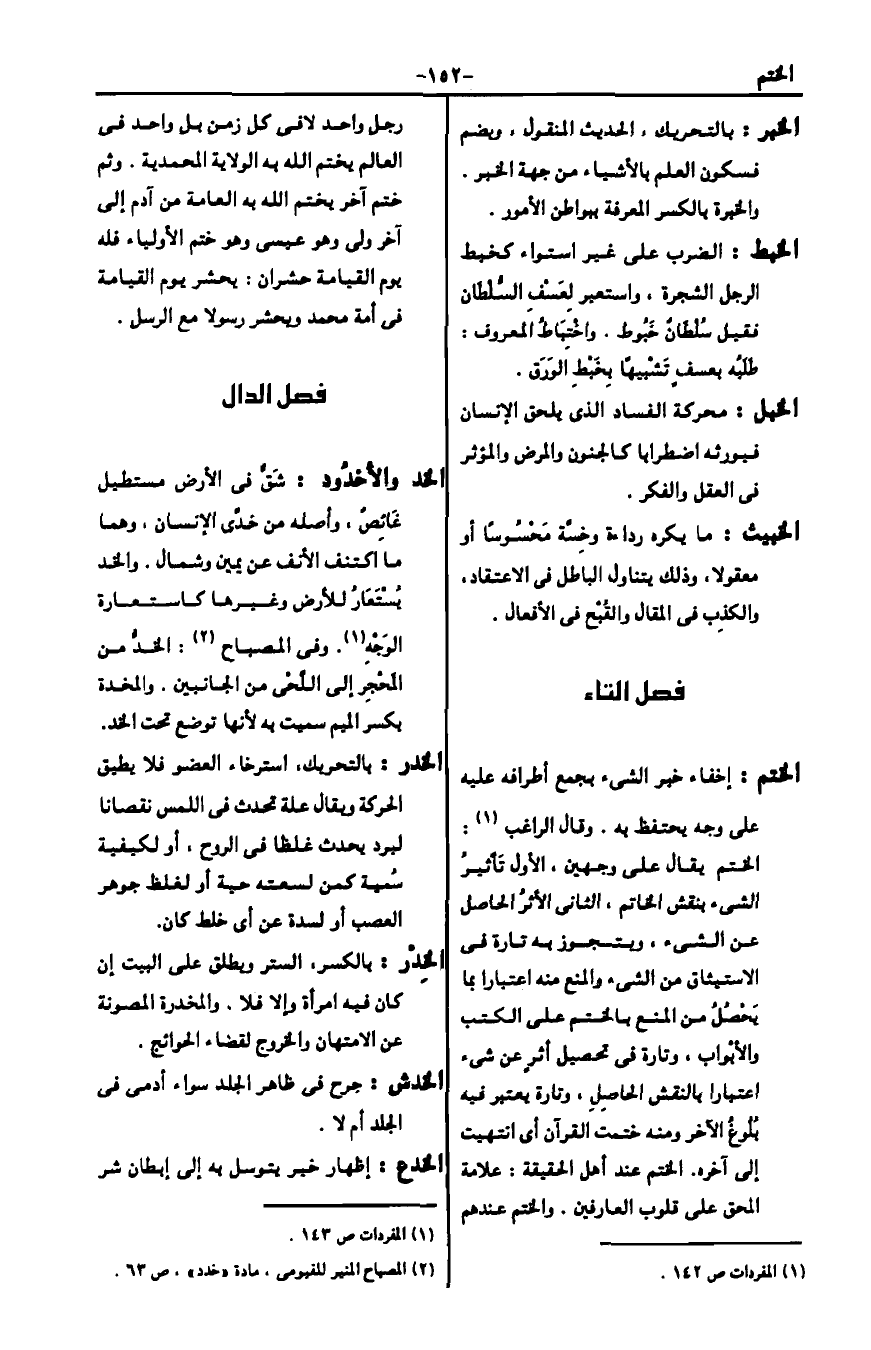 الختم: إخفاء خبر الشيء بجمع أطرافه عليه على وجه ينحفظ به. وقال الراغب1: الختم يقال على وجهين، الأول تأثير الشيء بنقش الخاتم. الثاني الأثر الحاصل عن الشيء، ويتجوز به تارة في الاستيثاق من الشيء والمنع منه اعتبارا بما يحصل من المنع بالختم على الكتب والأبواب، وتارة في تحصيل أثر عن شيء اعتبارا بالنقش الحاصل، وتارة يعتبر فيه بلوغ الآخر ومنه ختمت القرآن أي انتهيت إلى آخره. الختم عند أهل الحقيقة: علامة المحق على قلوب العارفين. الختم عندهم رجل واحد لا في كل زمن بل واحد في العالم يختم الله به الولاية العامة المحمدية. وثم ختم آخر يختم الله به الولاية العامة من آدم إلى آخر ولي وهو عيسى هو ختم الأولياء فله يوم القيامة حشران: يحشر في أمة محمد ويحشر رسولا مع الرسل.