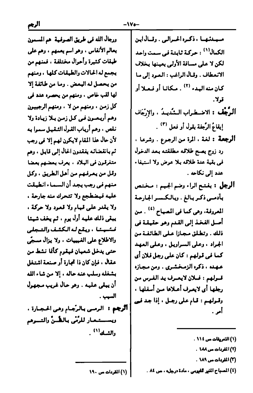 الرجل: بفتح الراء وضم الجيم: مختص بآدمي ذكر بالغ. وبالكسر الجارحة المعروفة، وهي كما في المصباح4. من أصل الفخذ إلى القدم وهي حقيقة في ذلك. وتطلق مجازا على الطائفة من الجراد، وعلى السراويل، وعلى العهد كما في قولهم: كان على رجل فلان أي عهده، ذكره الزمخشري. ومن مجازه قولهم: فلان لا يعرف يد القوس من رجلها أي لا يعرف أعلاها من أسفلها، وقولهم: قام على رجل، إذا جد في أمر. ورجال الله في طريق الصوفية هم المسمون بعالم الأنفاس، وهو اسم يعمهم، وهم على طبقات كثيرة وأحوال مختلفة، فمنهم من تجمع له الحالات والطبقات كلها، ومنهم من يحصل له البعض. وما من طائفة إلا لها لقب خاص، ومنهم من يحصره عدد في كل زمن، ومنهم من لا، ومنهم الرجبيون وهم أربعون في كل زمن بلا زيادة ولا نقص، وهم أرباب القول الثقيل سموا به لأن حال هذا المقام لا يكون لهم إلا في رجب ثم بانقضائه يفقدون الحال إلى قابل، وهم متفرقون بالبلاد، يعرف بعضهم بعضا وقل من يعرفهم من أهل الطريق، وكل منهم في رجب يجد أن السماء انطبقت عليه فيضطجع ولا تتحرك منه جارحة، ولا يقدر على قيام ولا قعود ولا حركة، يبقى ذلك عليه أول يوم، ثم يخف شيئا فشيئا، ويقع له الكشف والتجلي والاطلاع على المغيبات، ولا يزال مسجى حتى يدخل شعبان فيقوم كأنما نشط من عقال، فإن كان ذا تجارة أو صنعة اشتغل بشغله وسلب عنه حاله، إلا من شاء الله أن يبقى عليه. وهو حال غريب مجهول السبب.