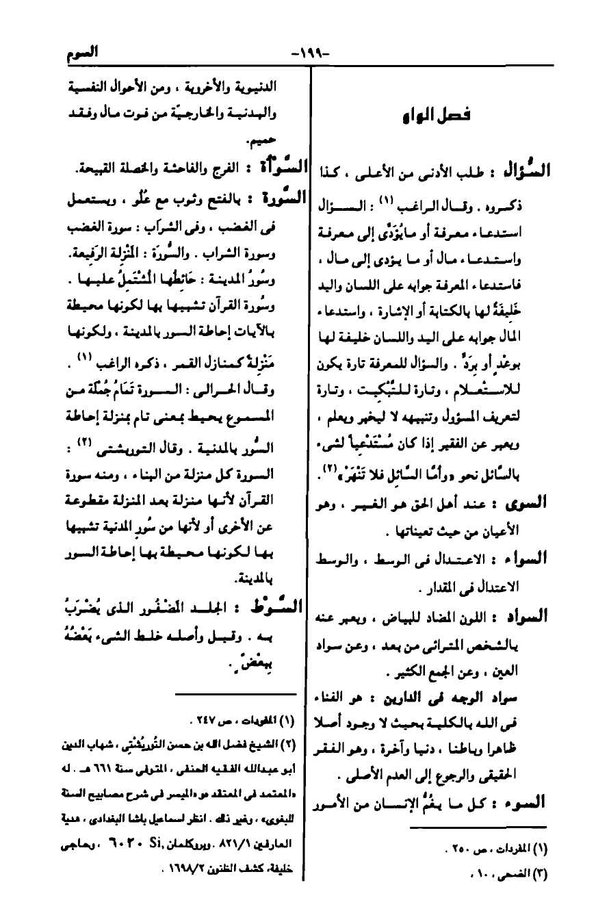 السؤال: طلب الأدنى من الأعلى، كذا ذكروه. وقال الراغب1: السؤال استدعاء معرفة أو ما يؤدي إلى معرفة واستدعاء مال أو ما يؤدي إلى مال، فاستدعاء المعرفة جوابه على اللسان واليد خليفة لها بالكتابة أو الإشارة، واستدعاء المال جوابه على اليد واللسان خليفة لها بوعد أو برد. والسؤال للمعرفة تارة يكون للاستعلام، وتارة للتبكيت، وتارة لتعريف المسئول وتنبيهه لا لتحر وتعلم، ويعبر عن الفقير إذا كان مستدعيا لشيء بالسائل تجوزا نحو {وَأَمَّا السَّائِلَ فَلَا تَنْهَر} 2.