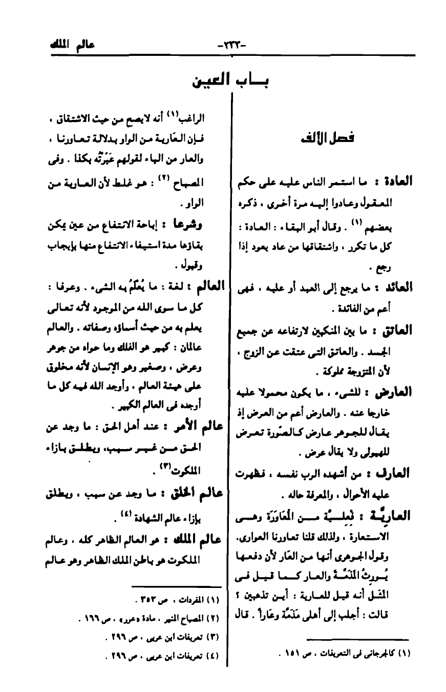 العالم: لغة: ما يعلم به الشيء. وعرفا: كل ما سوى الله من الموجودات لأنه تعالى يعلم به من حيث أسماؤه وصفاته. والعالم عالمان: كبير وهو الفلك وما حواه من جوهر وعرض، وصغير وهو الإنسان لأنه مخلوق على هيئة العالم، وأوجد الله فيه كل ما أوجده في العالم الكبير.