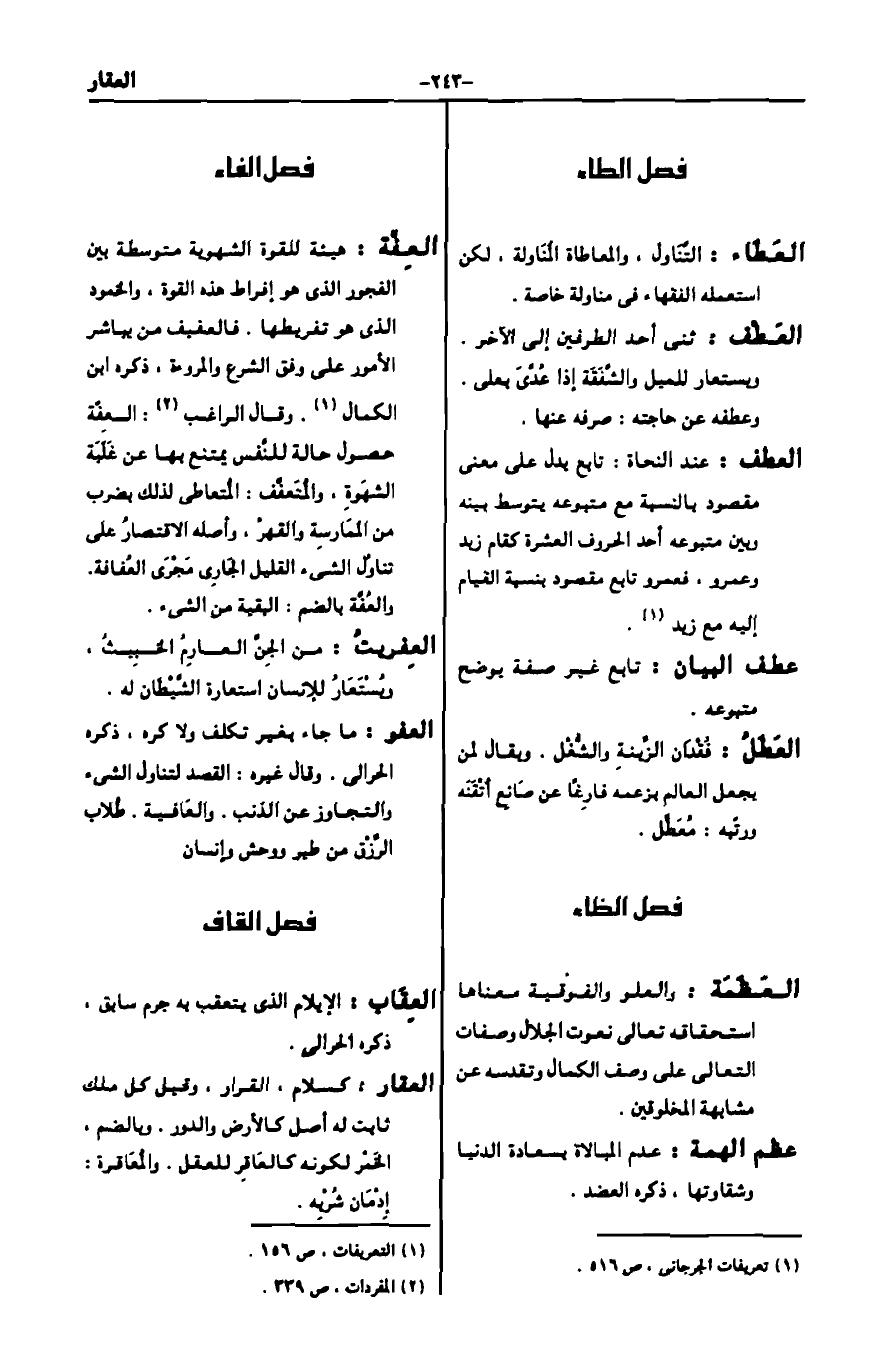 العفة: هيئة للقوة الشهوية متوسطة بين الفجور الذي هو إفراط هذه القوة، والجمود الذي هو تفريطها. فالعفيف من يباشر الأمور على وفق الشرع والمروءة، ذكره ابن الكمال1. وقال الراغب2: العفة حصول حالة للنفس يمتنع بها عن غلبة الشهوة، والمتعفف: المتعاطي لذلك بضرب من الممارسة والقهر، وأصله الاقتصار على تناول الشيء القليل الجاري مجرى العفافة. والعفة بالضم البقية من الشيء.