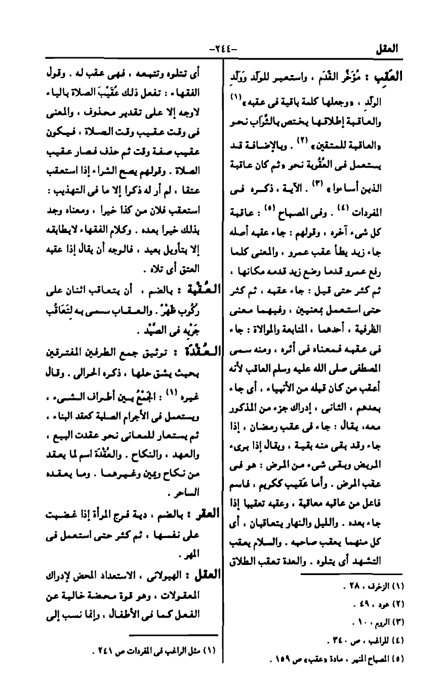 5 المصباح المنير، مادة "عقب" ص159.