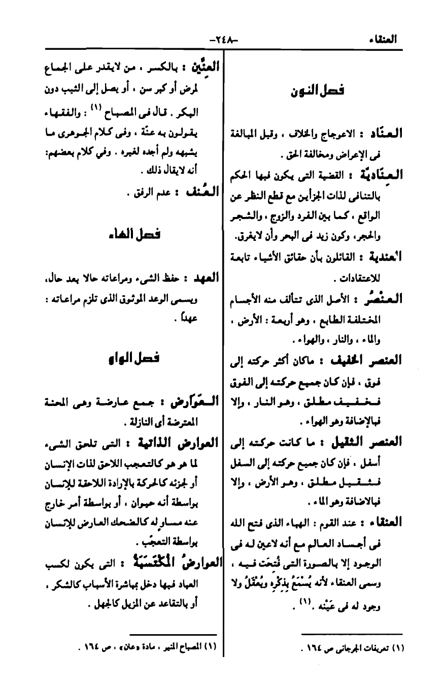 العنين: بالكسر، من لا يقدر على الجماع لمرض أو كبر سن، أو يصل إلى الثيب دون البكر. قال في المصباح2: والفقهاء يقولون به عنة، وفي كلام الجوهري ما يشبهه ولم أجده لغيره. وفي كلام بعضهم: إنه لا يقال ذلك.