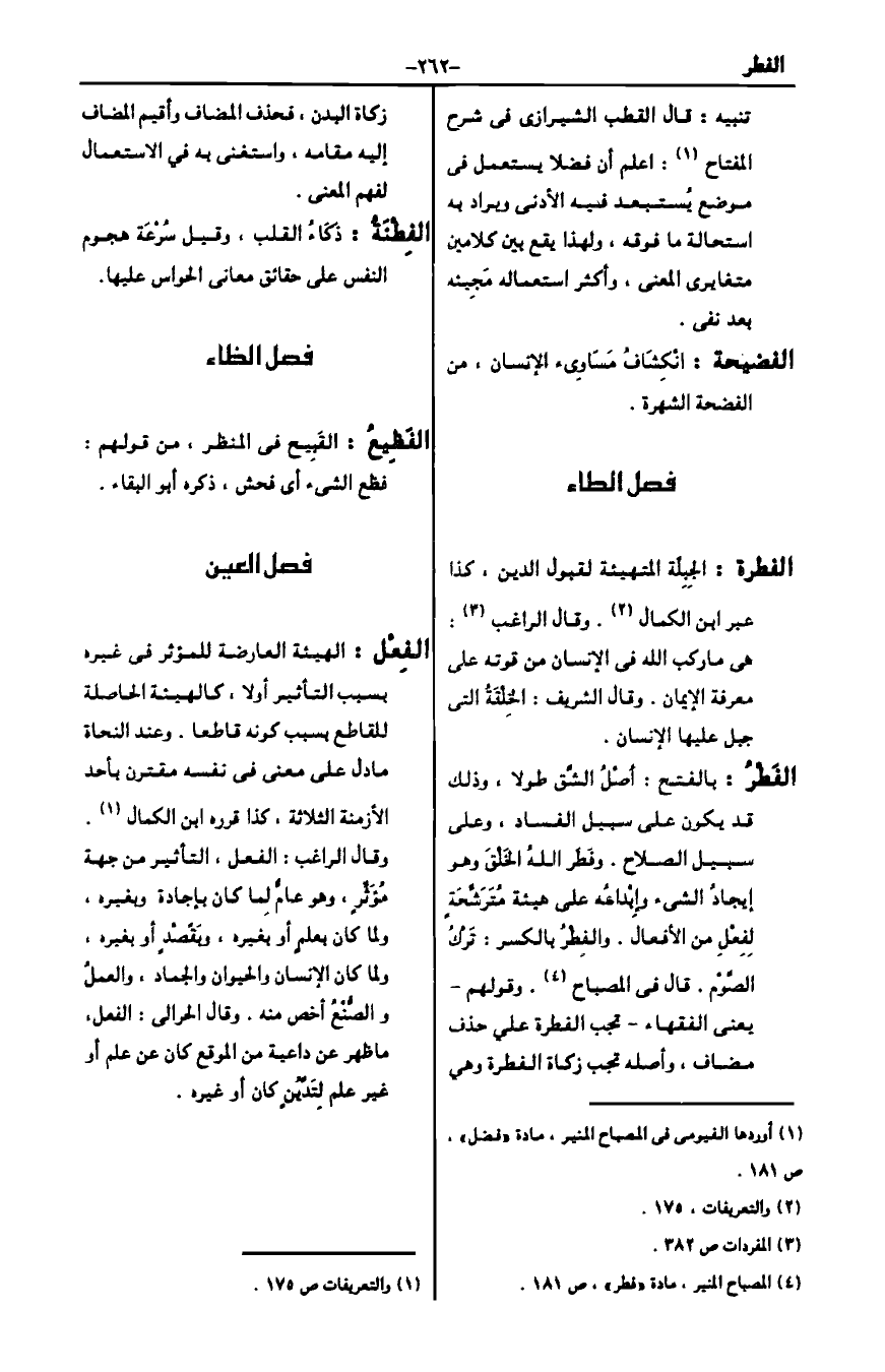 الفطر: بالفتح: أصله الشق طولا، وذلك قد يكون على سبيل الفساد، وعلى سبيل الصلاح. وفطر الله الخلق وهو إيجاد الشيء وإبداعه على هيئة مترشحة لفعل من الأفعال. والفطر بالكسر: ترك الصوم. قال في المصباح3. وقولهم -يعني الفقهاء- تجب الفطرة على حذف مضاف، وأصله تجب زكاة الفطرة وهي زكاة البدن، فحذف المضاف وأقيم المضاف إليه مقامه، واستغنى به في الاستعمال لفهم المعنى.