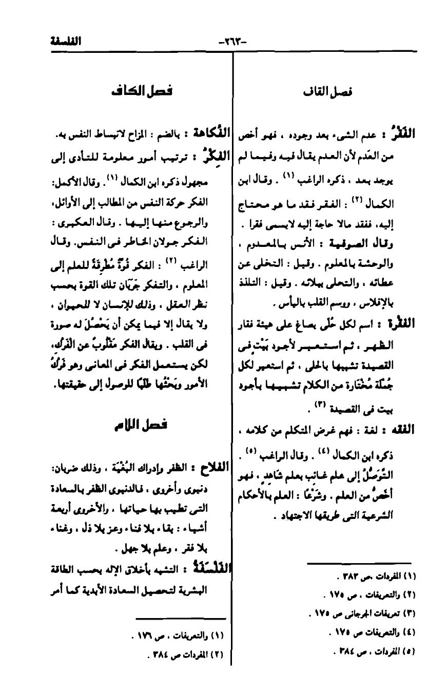 الفكر: ترتيب أمور معلومة للتأدي إلى مجهول ذكره ابن الكمال1. وقال الأكمل: الفكر حركة النفس من المطالب إلى الأوائل، والرجوع منها إليها. وقال العكبري: الفكر جولان الخاطر في النفس. وقال الراغب2: الفكر قوة مطرقة للعلم إلى المعلوم، والتفكر جريان تلك القوة بحسب نظر العقل، وذلك للإنسان لا للحيوان، ولا يقال إلا فيما يمكن أن يحصل له صورة في القلب. وقيل الفكر مقلوب عن الفرك، لكن يستعمل الفكر في المعاني وهي فرك الأمور وبحثها طلبا للوصول إلى حقيقتها.