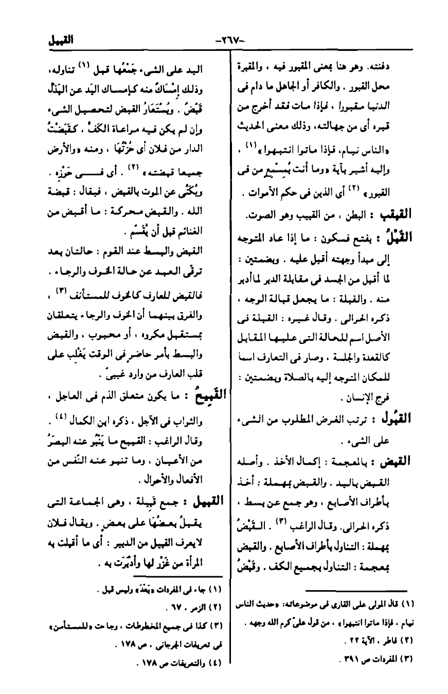 القبال: بالكسر زمام النعل. ومنه قولهم: دع رجلي ورجلك في نعل ما وسعهما القبال. القبر: مقر الميت. وهو في الأصل مصدر قبرته إذا دفنته. وهو هنا بمعنى المقبور فيه، والمقبرة محل القبور. والكافر أو الجاهل ما دام في الدنيا مقبورا، فإذا مات فقد أخرج من قبره أي جهالته، وذلك معنى حديث "الناس نيام، فإذا ماتوا انتبهوا" 1، وإليه أشير بأنه {وَمَا أَنْتَ بِمُسْمِعٍ مَنْ فِي الْقُبُور} 2 أي الذين في حكم الأموات.