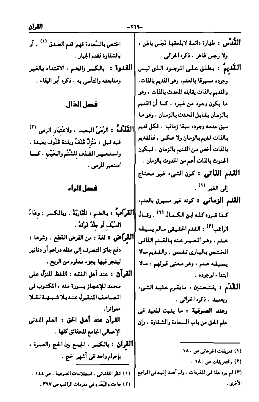 القدم الزماني: كونه غير مسبوق بالعدم، كذا قرره ابن الكمال2. وقال الراغب3: القدم الحقيقي ما لم يسبقه عدم، وهو المعبر عنه بالقدم الذاتي المختص بالباري تقدس. والقديم ما لا يسبق وجوده عدم، وهو معنى قولهم: ما لا ابتداء لوجوده.