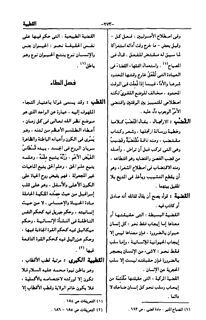 القطب: وقد يسمى غوثا باعتبار التجاء الملهوف إليه، عبارة عن الواحد الذي هو موضع نظر الله تعالى في كل زمان، أعطاه الطلسم الأعظم من لدنه، وهو يسري في الكون وأعيانه الباطنة والظاهرة سريان الروح في الجسد، بيده قسطاس الفيض الأعم، وزنه يتبع علمه، وعلمه يتبع علم الحق، وعلم الحق يتبع الماهيات غير المجعولة، فهو يفيض روح الحياة على الكون الأعلى والأسفل، وهو قلب إسرافيل من حيث حصته الملكية الحاملة مادة الحياة والإحساس، لا من حيث إنسانيته، وحكم جبريل فيه كحكم النفس الناطقة في النشأة الإنسانية، وحكم ميكائيل فيه كحكم القوة الجاذبة فيها، وحكم عزرائيل فيه كحكم القوة الدافعة فيها1.